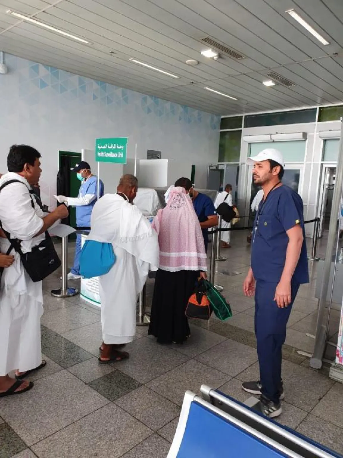 حيث بلغ عدد الحجاج القادمين على متن هذه الرحلة ٢٣٥ حاج ، و كان في استقبالهم فريق عمل متكامل تابع لمراكز المراقبة الصحية بالمطار بقيادة مدير مراكز المراقبة الصحية الدكتور أيمن سمان ، وتنفيذ جميع الخطط الصحية والوقائية لتوفير الرعاية الصحية لأول رحلة حجاج تصل عبر المطار وتطبيق كافة الإشتراطات الصحية عليهم كأول الإجراءات لحظة دخولهم صالة المطار.