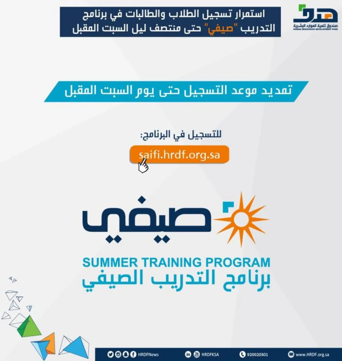 كشف صندوق تنمية الموارد البشرية (هدف)، عن قبول 17500 طالب وطالبة في برنامج التدريب الصيفي " صيفي" حتى الآن، علما أن تسجيل الطلاب استمر حتى نهاية يوم السبت.
