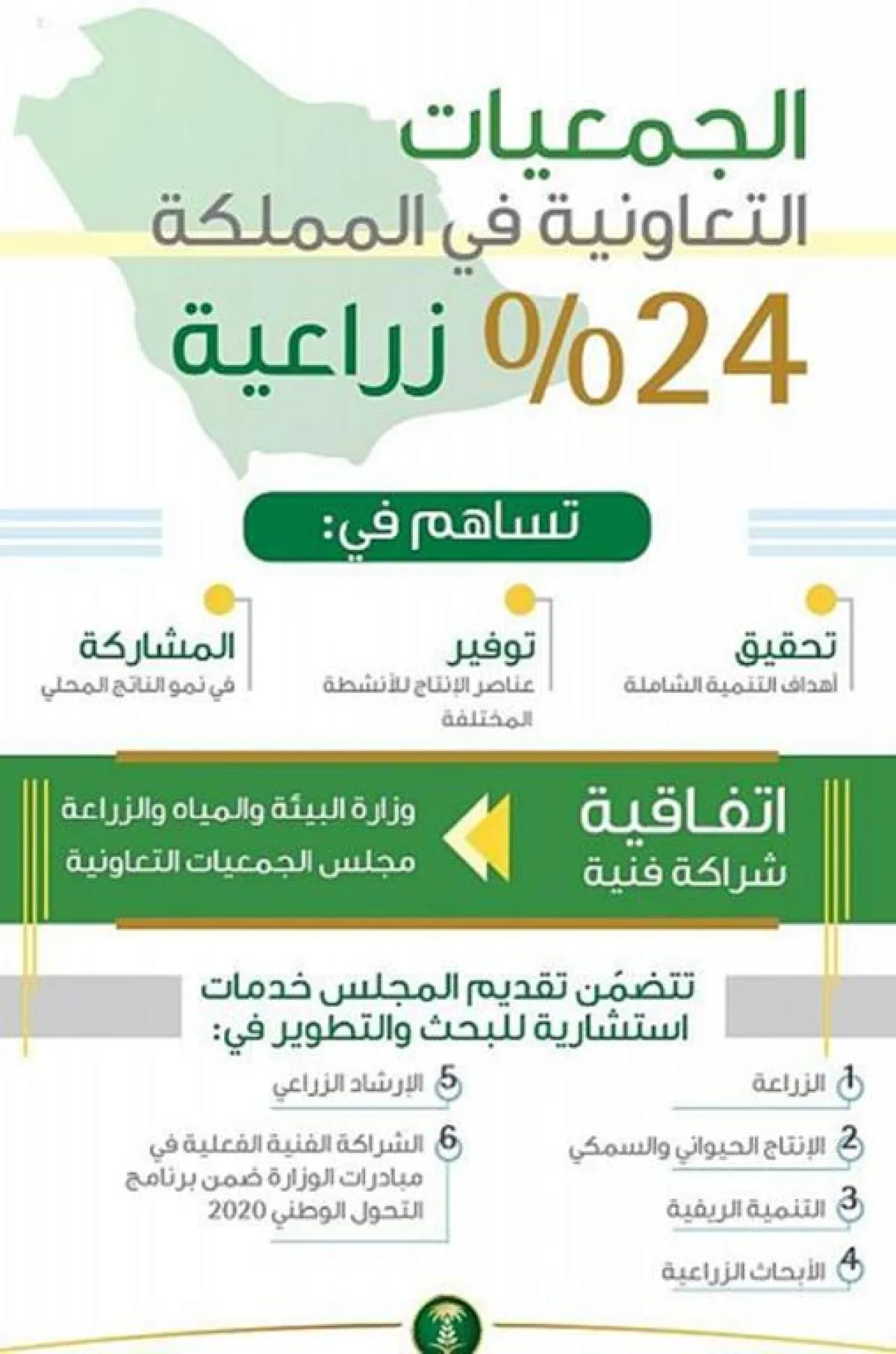 وأبرمت وزارة البيئة والمياه والزراعة اتفاقية شراكة فنية مع مجلس الجمعيات التعاونية، تضمنت تقديم المجلس الخدمات الاستشارية للبحث والتطوير في مجالات الزراعة والإنتاج الحيواني والسمكي والتنمية الريفية والأبحاث الزراعية والإرشاد الزراعي للوزارة، إضافة إلى الشراكة الفنية الفعلية في مبادرات الوزارة ضمن برنامج التحول الوطني 2020، والشراكة الفنية لتطوير معايير وضوابط وسياسات خدمات الوزارة المتنوعة في المجالات الزراعية المختلفة، فضلاً عن المشاركة في دراسة الأنظمة الزراعية.