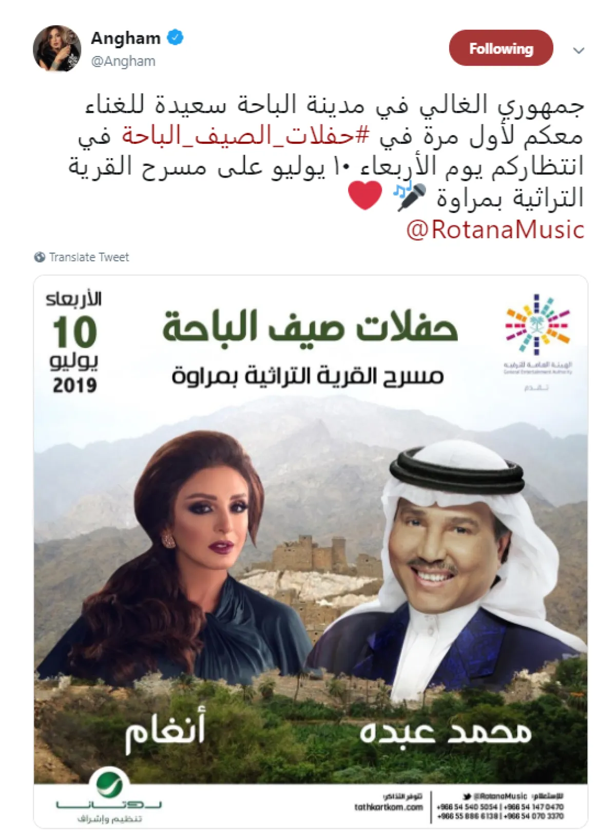 أنغام تعود إلى حفلاتها بالمملكة العربية السعودية للمرة السادسة، ولكن الحفل المنتظر هو الأول لها ضمن حفلات صيف الباحة كما أنه أول حفل لها برفقة الفنان محمد عبده في بلاده، ولهذا قررت توجيه رسالة خاصة إلى جمهورها هناك عبر حسابها بموقع تويتر قائلة: جمهوري الغالي في مدينة الباحة سعيدة للغناء معكم لأول مرة في حفلات الصيف الباحة.. في انتظاركم يوم الأربعاء ١٠ يوليو على مسرح القرية التراثية بمراوة.