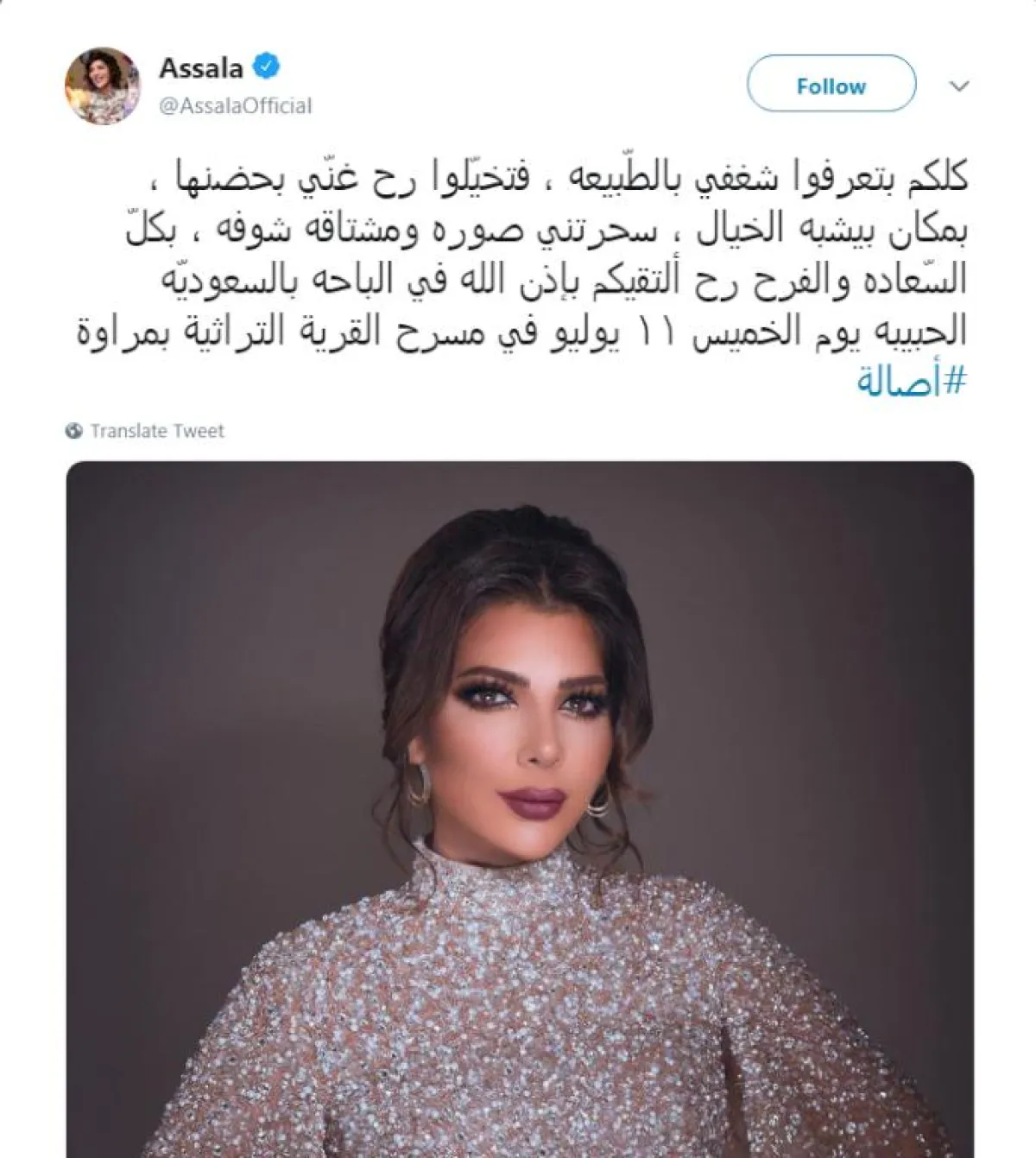 وقالت أصالة في تغريدتها: "كلكم بتعرفوا شغفي بالطبيعة، فتخيَّلوا رح غني بحضنها، بمكان بيشبه الخيال، سحرتني صوره ومشتاقة شوفه، بكل السعادة والفرح رح ألتقيكم بإذن الله في الباحة بالسعودية الحبيبة يوم الخميس ١١ يوليو في مسرح القرية التراثية بمراوة".