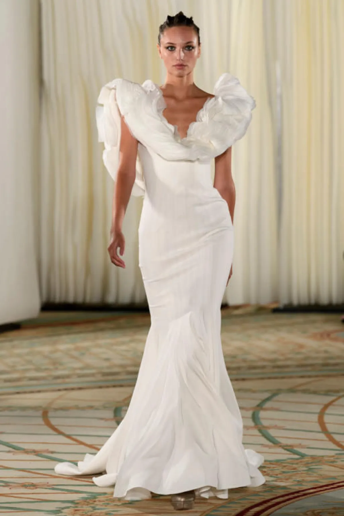 اعتمدت مجموعة Iris van herpe إريس فان هربيه اللمسات الفنية المبدعة في مجموعتها ككل، وكأنّ الفستان عبارة عن لوحة مرسومة ثلاثية الأبعاد، وكان من بينها فستان الزفاف الأبيض من الأورغانزا الشفافة، بلمسة ناعمة.