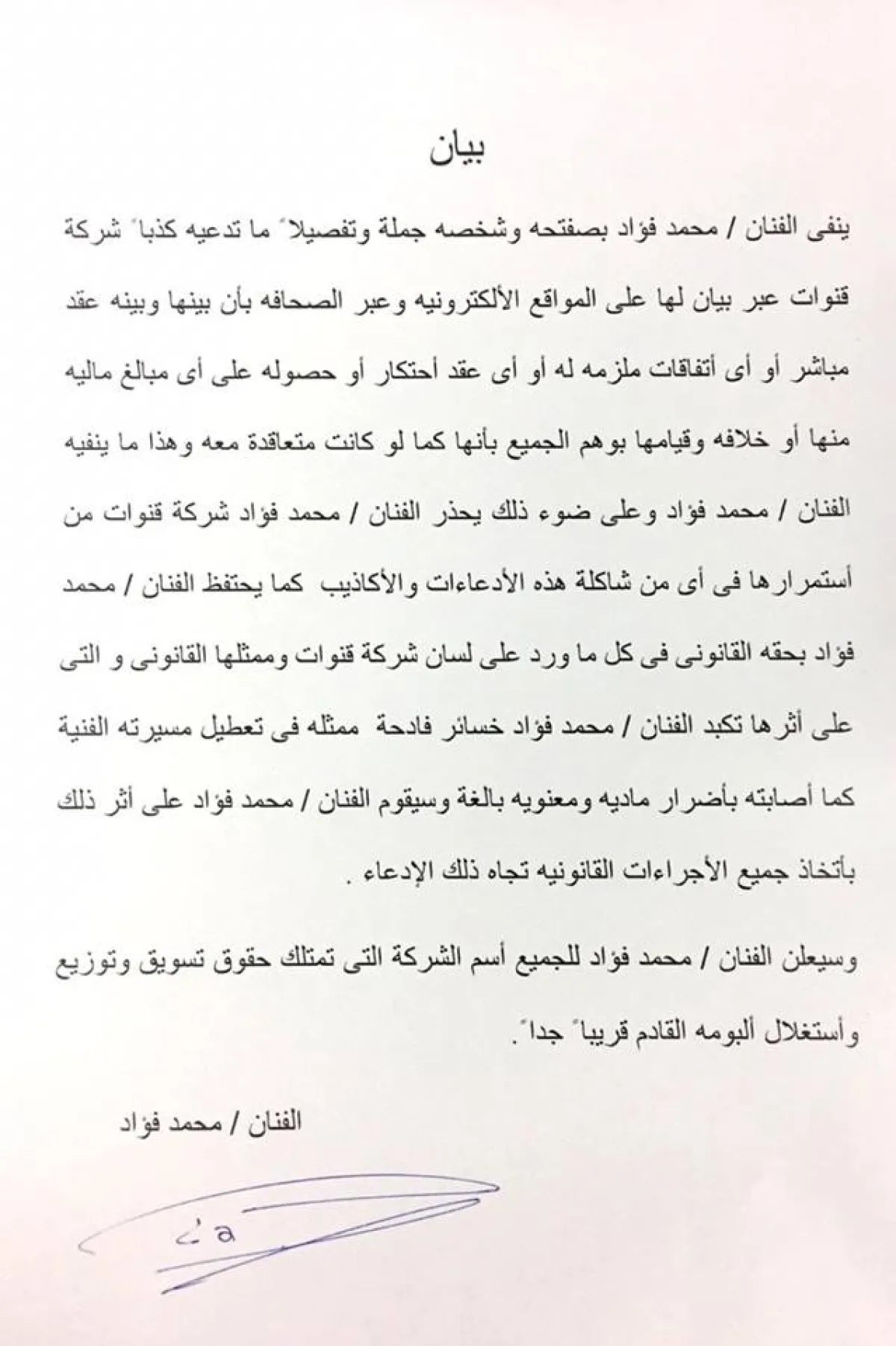 وقال فؤاد عبر البيان الرسمي: ينفى الفنان محمد فؤاد بصفته وشخصه جملة وتفصيلا ً ما تدعيه كذبا ً شركة قنوات عبر بيان لها على المواقع الإلكترونية وعبر الصحافة بأن بينها وبينه عقد مباشر أو أي اتفاقات ملزمه له أو أي عقد احتكار أو حصوله على أي مبالغ ماليه منها أو خلافه وقيامها بوهم الجميع بأنها كما لو كانت متعاقدة معه.