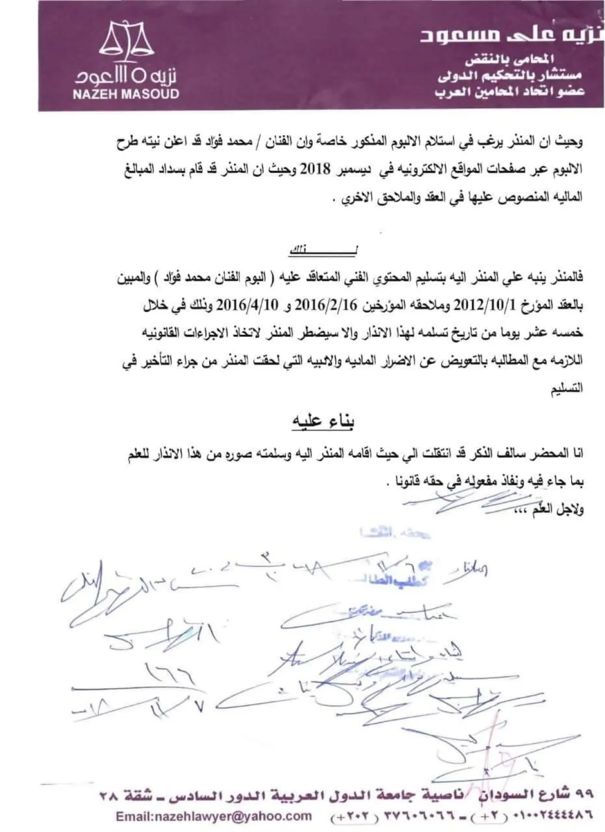وسبق أن وجهت شركة "قنوات" تحذيرا إلى جميع الشركات الأخرى من التعاون مع فؤاد وتسويق ألبومه الجديد، لأنها صاحبة الحق الحصري بتعاقد تم منذ العام 2012ـ وحسب بيان رسمي مدعم بوثائق "أكدت صحتها" قالت الشركة أنها قامت بإرسال إنذار رسمي إلى شركة "هاي فديلتي" المسئولة عن الفنان محمد فؤاد وإدارة أعماله، بضرورة تسليم الألبوم المتفق عليه منذ عام 2012، والذي كان المقرر طرحه مؤخرا ولكنه امتنع عن تسليمه لهم، وتضمن الإنذار ما يؤكد أن شركة قنوات لخدمات الاتصالات والانترنت هي صاحبة الحق الحصري لاستغلال هذا الألبوم بموجب العقد الموقع مع شركة هاي فيدلتي المؤرخ 1 أكتوبر 2012، والمقضي بصحة توقيعه في الدعوى رقم 8111 لسنة 2012 مدينة نصر، وملاحقة المؤرخة 16 فبراير 2016 و10 إبريل 2016، وتم سداد المبالغ الملية المتفق عليها بموجب شيكات بنكية قامت شركة هاي فيدلتي بصرفها.
