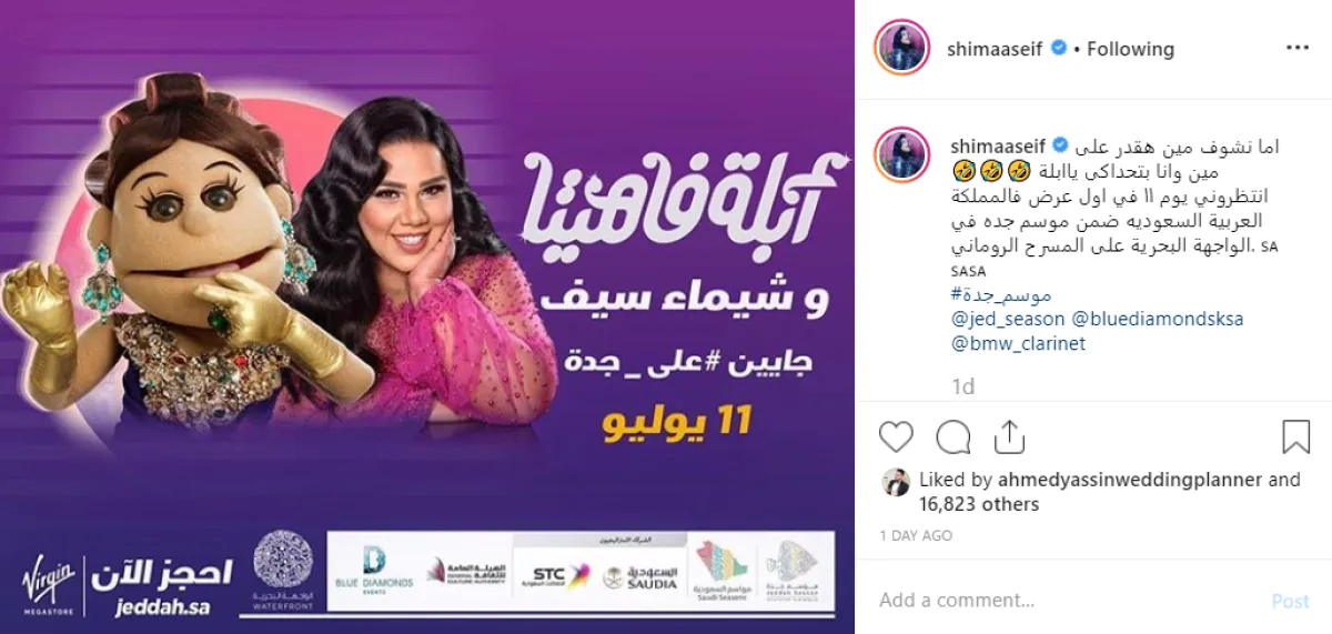 ونشرت شيماء عبر صفحتها الشخصية بموقع إنستقرام، صورة للبوستر الدعائي للحفل وعلقت عليها: أما نشوف مين هقدر على مين وأنا بتحداكي يا أبلة، انتظروني يوم ١١ في أول عرض في المملكة العربية السعودية ضمن موسم جدة في الواجهة البحرية على المسرح الروماني.