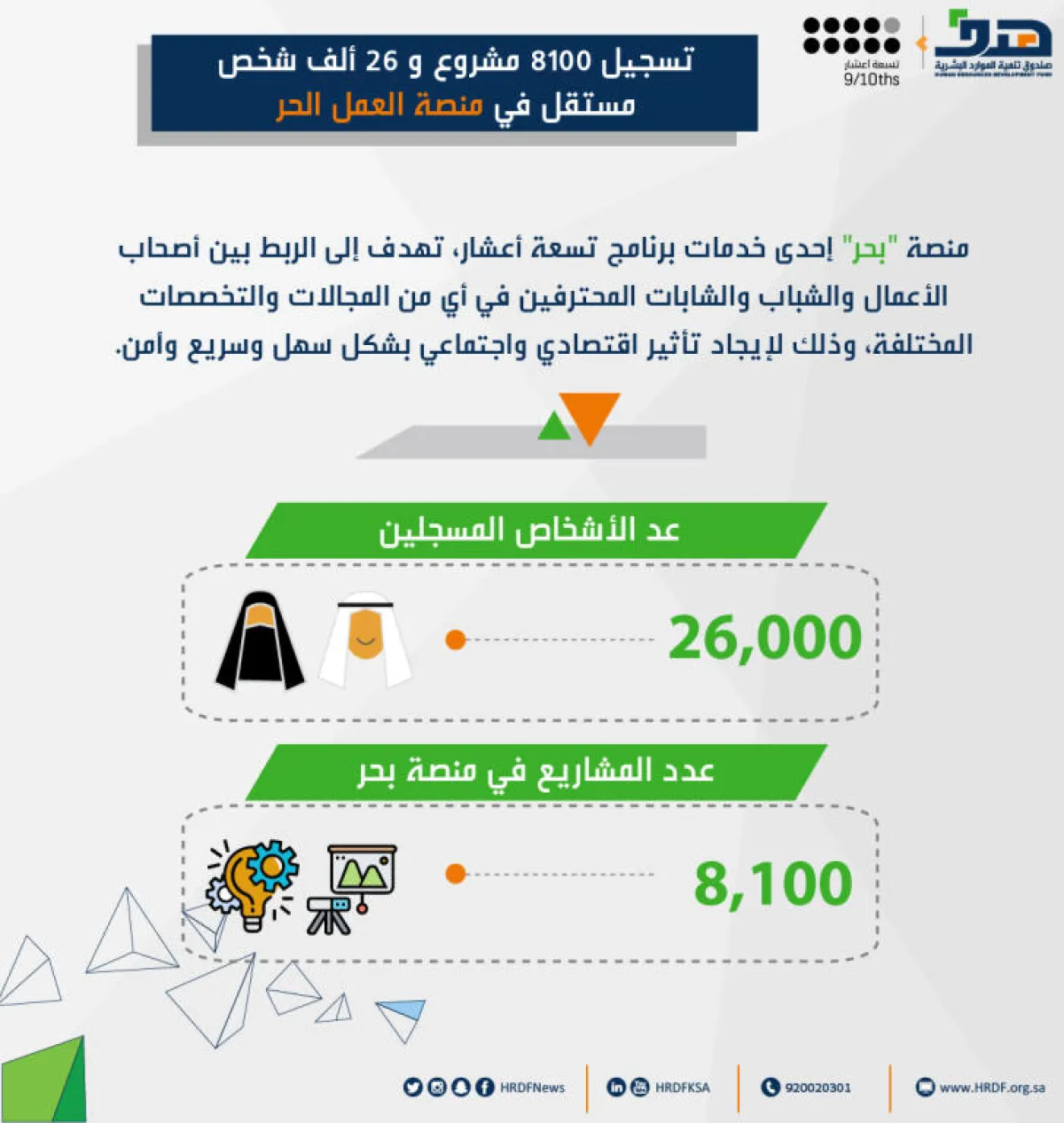 كشف صندوق تنمية الموارد البشرية (هدف)، عن تسجيل 8100 مشروع في منصة العمل الحر (بحر)، كما شهدت المنصة تسجيل أكثر من 26 ألف شخص مستقل، وتجاوزت قيمة المشاريع المنفذة على المنصة مليونين ونصف المليون ريال.