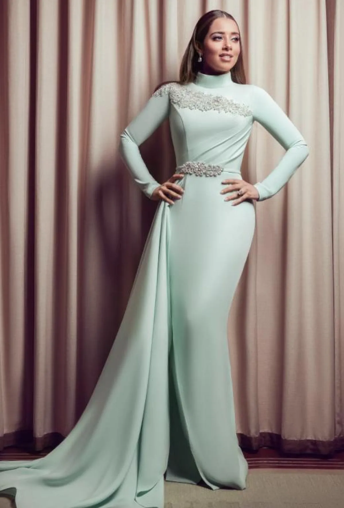 في مناسبة أُخرى أحيتها بلقيس فتحي في الكويت، شاهدناها وقد اختارت درجات الباستيل أيضًا، وهذه المرة اعتمدت اللون الأخضر الفاتح الذي ناسب لون بشرتها السمراء على فستان بتصميم محتشم من “ظاهر باقر” Thaher Baqer بقصة ياقة عالية وأكمام طويلة، مزين عند الخصر بحزام قماشي مرصع بحبات من الخرز باللون الفضي البراق، وقد اكتفت بأقراط ناعمة وخاتم ماسي أكملت بهما الاطلالة.