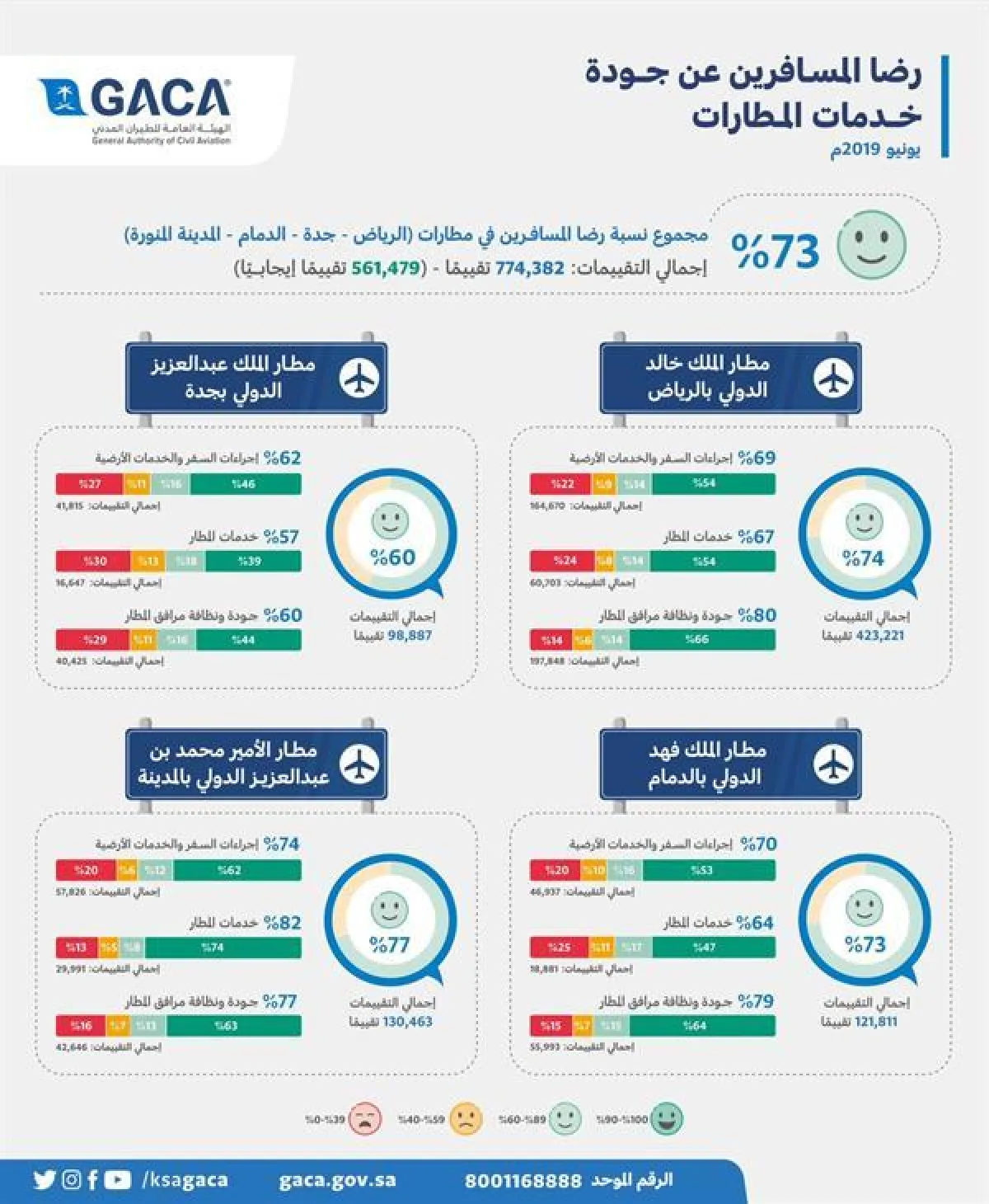 كشفت الهيئة العامة للطيران المدني، عن أن نسبة رضا المسافرين عن الخدمات المقدمة في مطارات الرياض وجدة والدمام والمدينة المنورة بلغت 73% خلال شهر يونيو 2019.