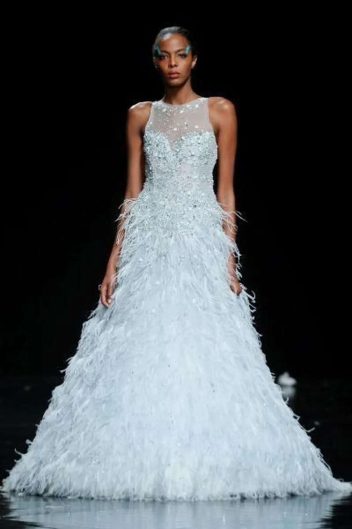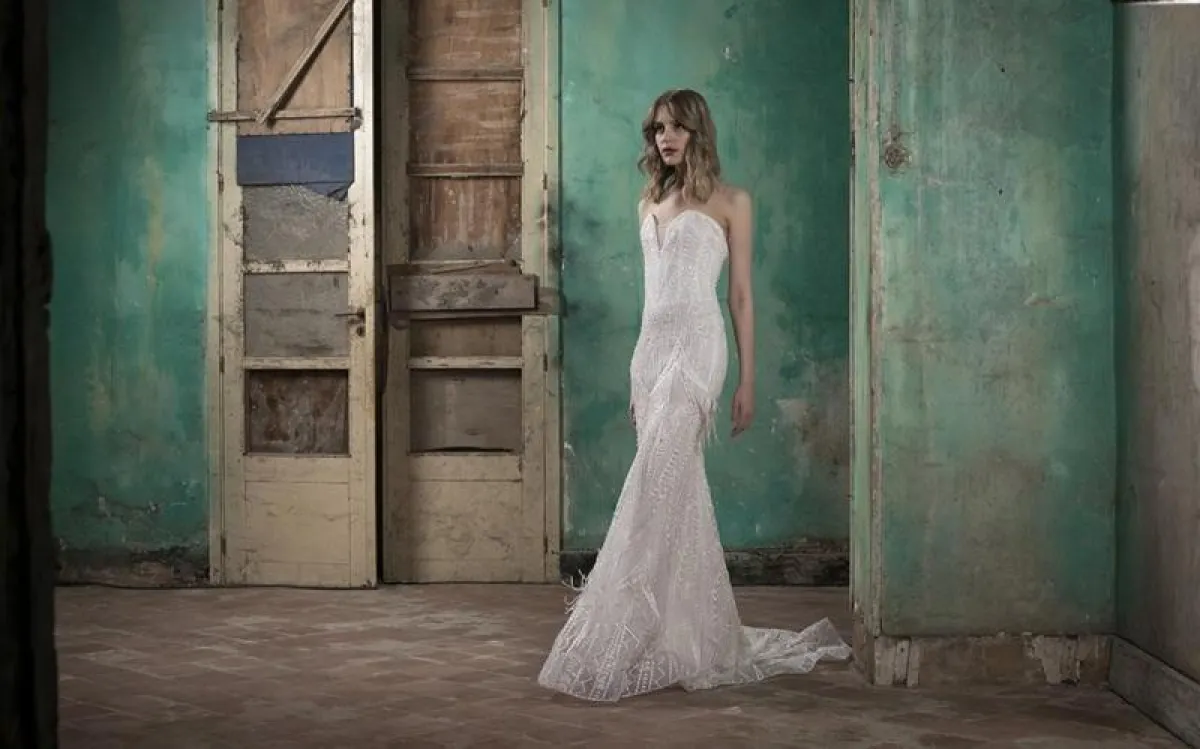 كما برزت فساتين الزفاف الريش في عرض أزياء Celia Kritharioti، وقدمت الماركة تصميم مغطى بالريش بالكامل، وآخر بتنورة مغطاة بالريش مع قطعة فوقية مرصعة بالتطريزات البارزة.