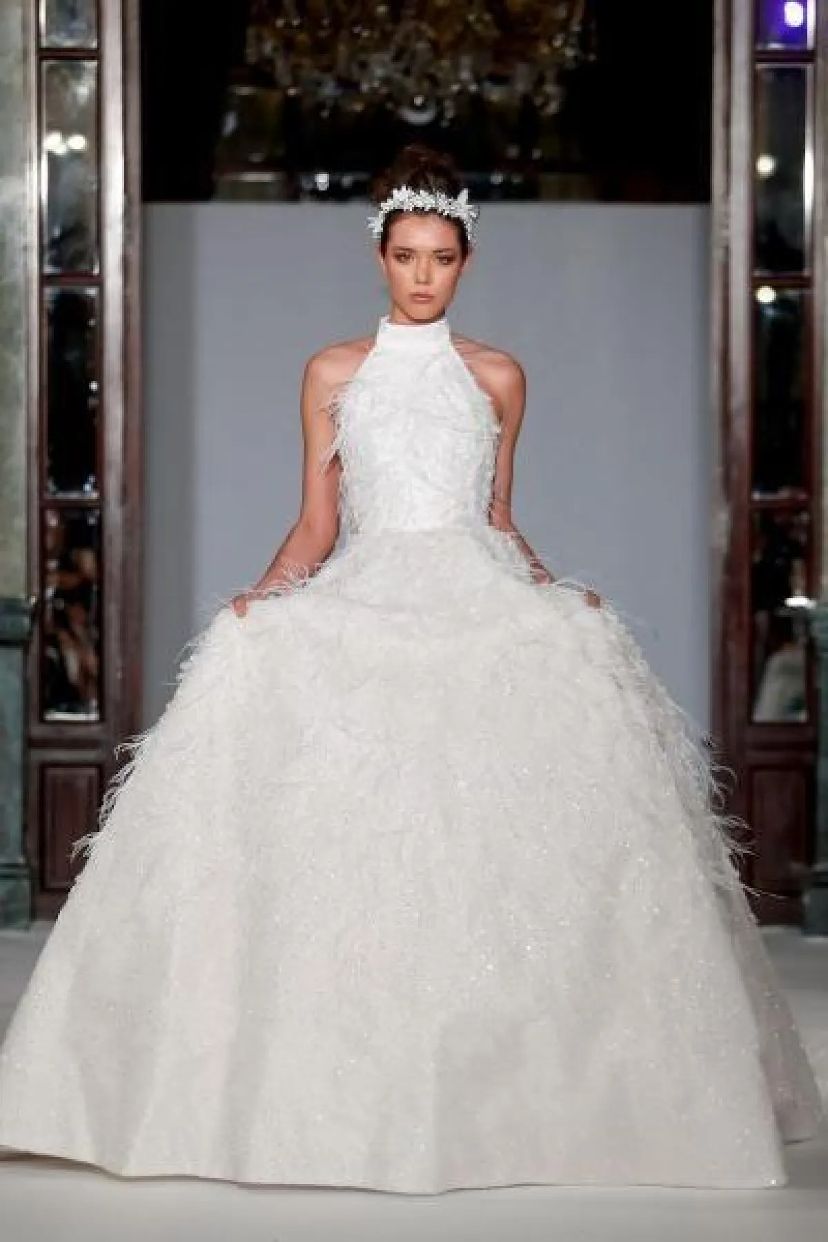قدمت ماركة Allin le kal فساتين زفاف مزينة بالريش الأبيض، وتميزت الفساتين بتصاميمها المنفوشة والفخمة.