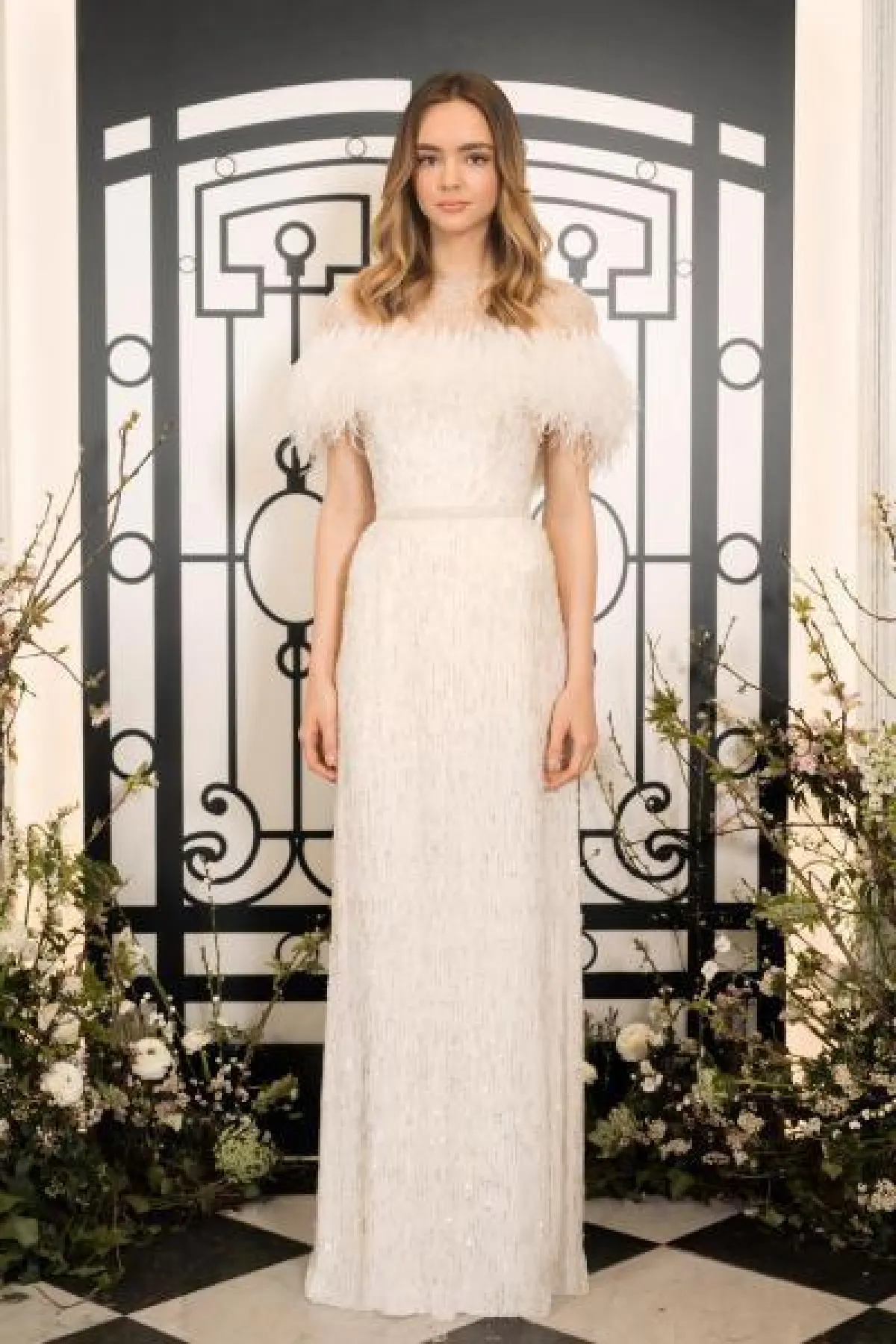 قدمت المصممة جيني باكهام jenny Packham موديلات متنوعة من فساتين الزفاف المزينة بالريش، منها فستان كاشف للأكتاف، بالإضافة إلى الفستان الطويل المزين بالريش على التنورة، والفساتين القصيرة المزينة بالريش.