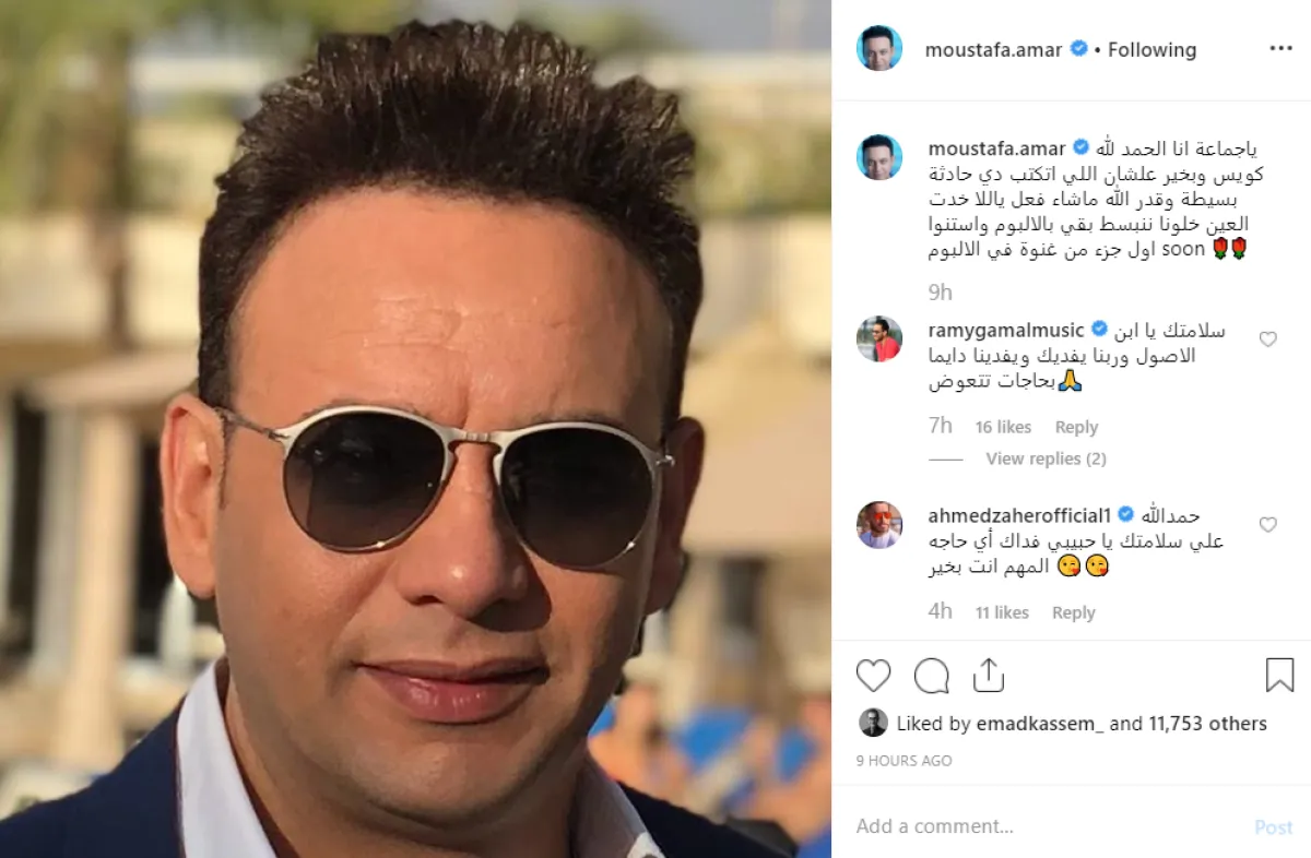 مصطفى قمر عقب على انتشار أنباء تعرضه لحداث مروع على الطريق السريع برسالة عبر حسابه بموقع إنستقرام قال فيها: يا جماعة انا الحمد لله كويس وبخير علشان اللي اتكتب دي حادثة بسيطة وقدر الله ما شاء فعل.