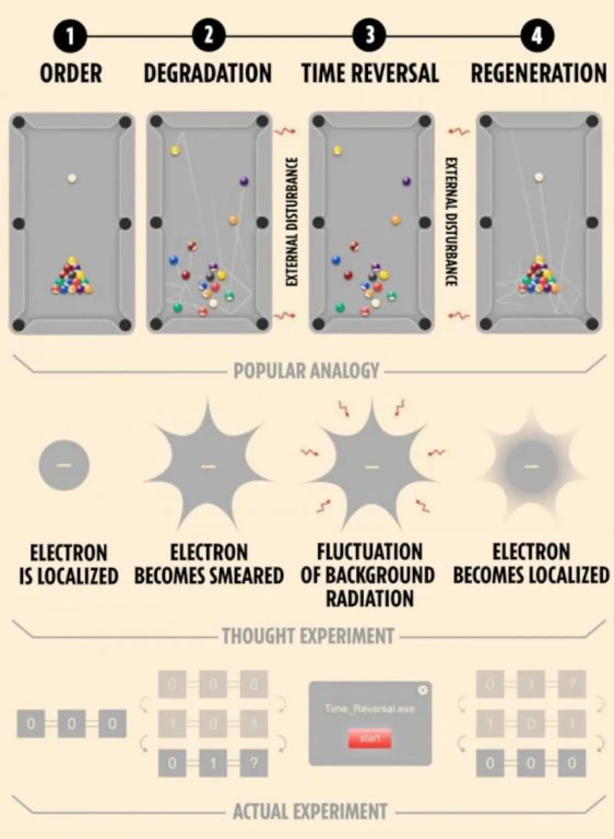 ومن المعروف أنه بعد الضربة الافتتاحية تتناثر الكرات بطريقة عشوائية، لكن الباحثين تمكنوا من جعل الكرات تعود إلى ترتيبها الأصلي قبل الضربة الافتتاحية، وبدوا وكأنهم يعيدون الزمن إلى الوراء، وذلك باستخدام جهاز كمبيوتر كمي خاص.
