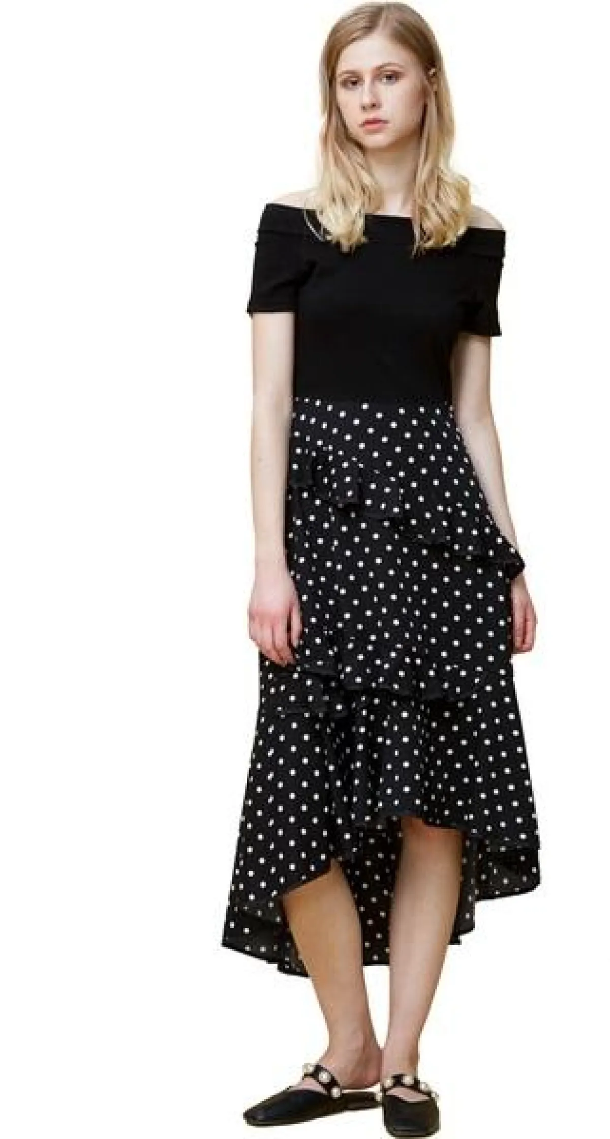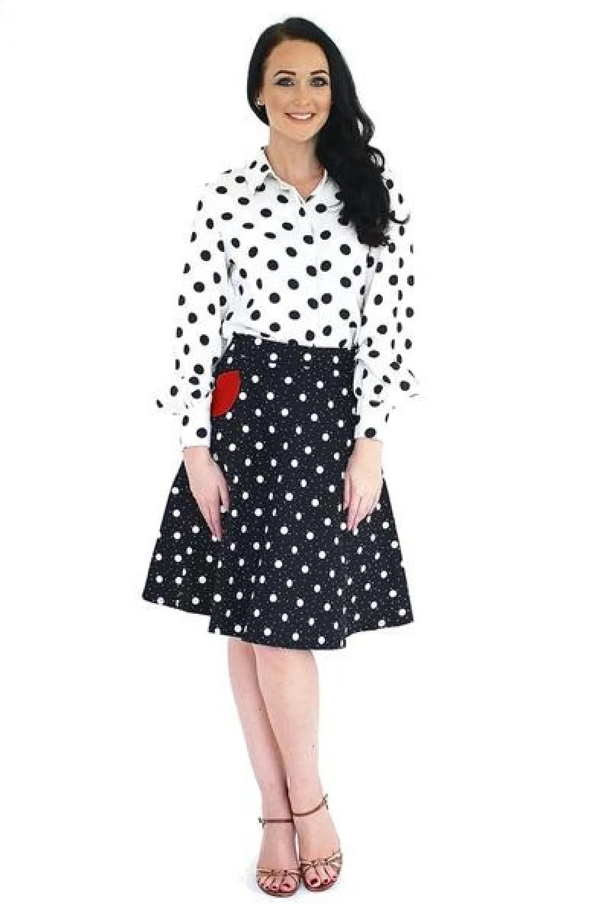 - طقماً مكوناً من قميص وتنورة باللون الأبيض والأسود المنقط من أون ذالوكس