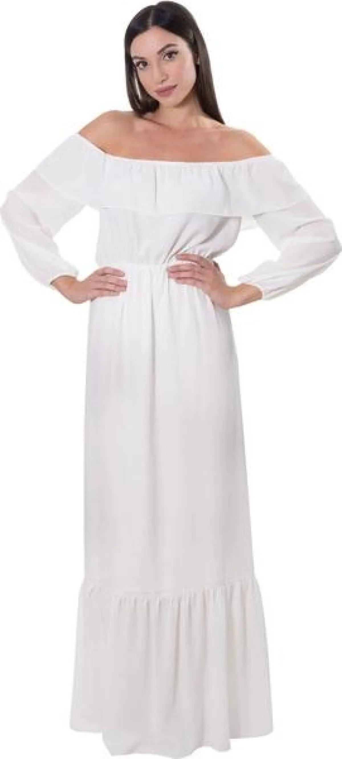 - فستان طويل باللون الأبيض مكشوف الاكتاف من كوكا