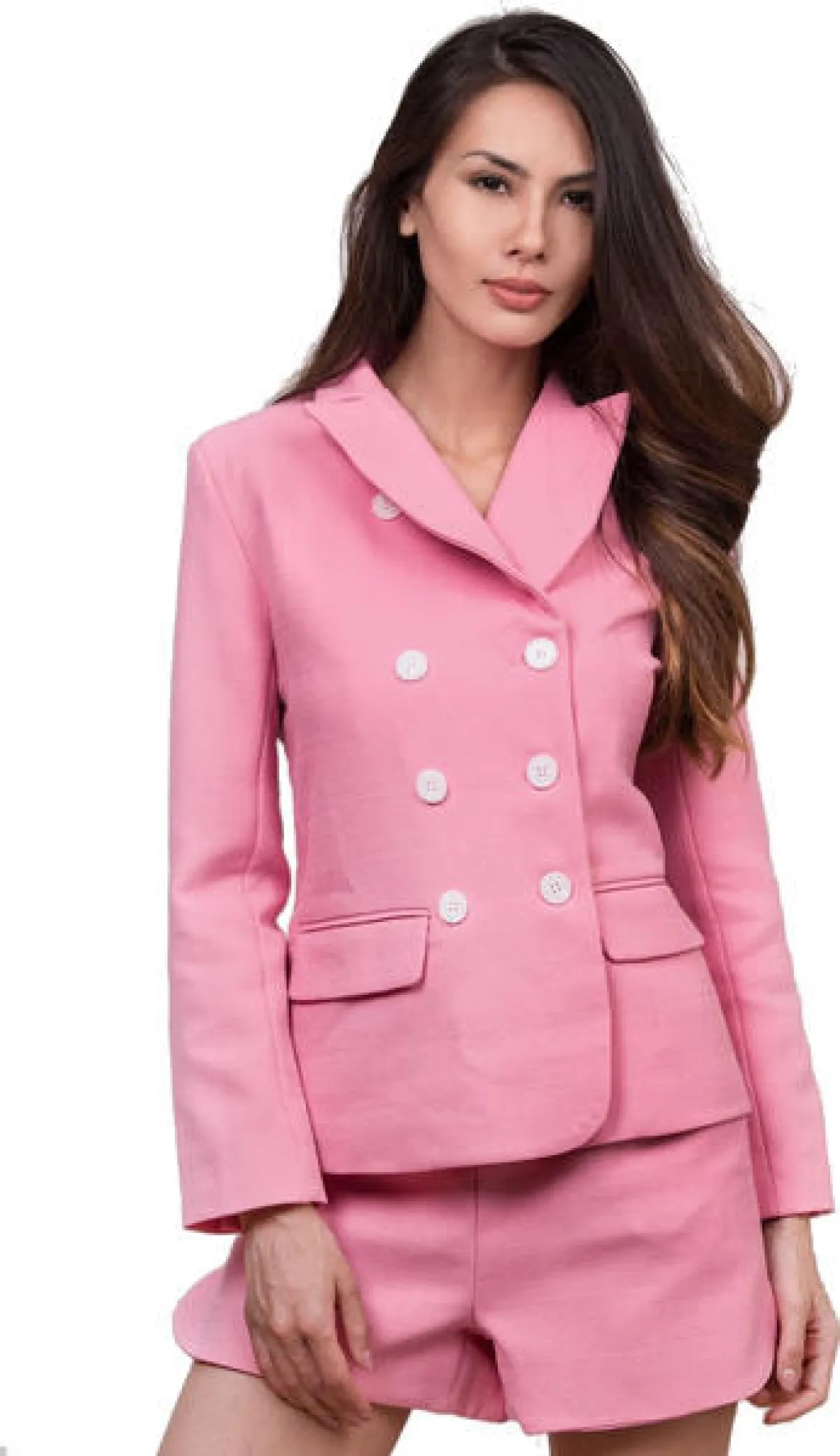 يعدّ الطقم من الإطلالات الأكثر الأناقة. ولا يزال بإمكانك اعتماده خلال أيام الصيف الحارّة من خلال تنسيق شورت وجاكيت بنفس اللون، تماماً مثل هذا الطقم المكوّن من جاكيت وشورت باللون الوردي وبأزرار بيضاء من أون ذالوكس.