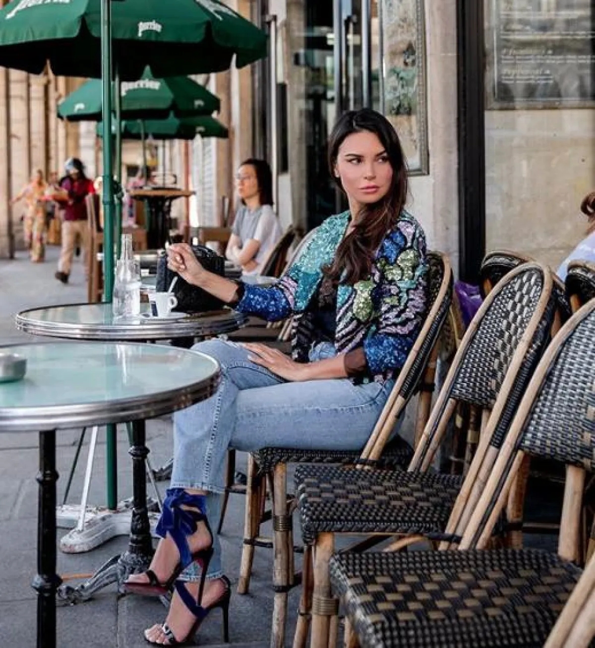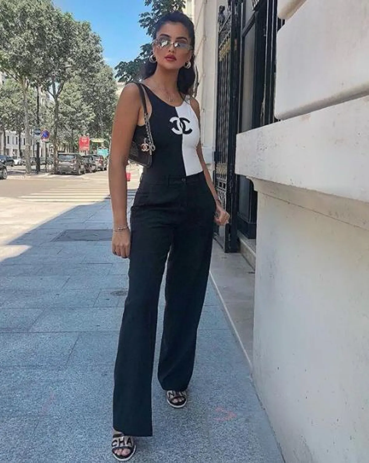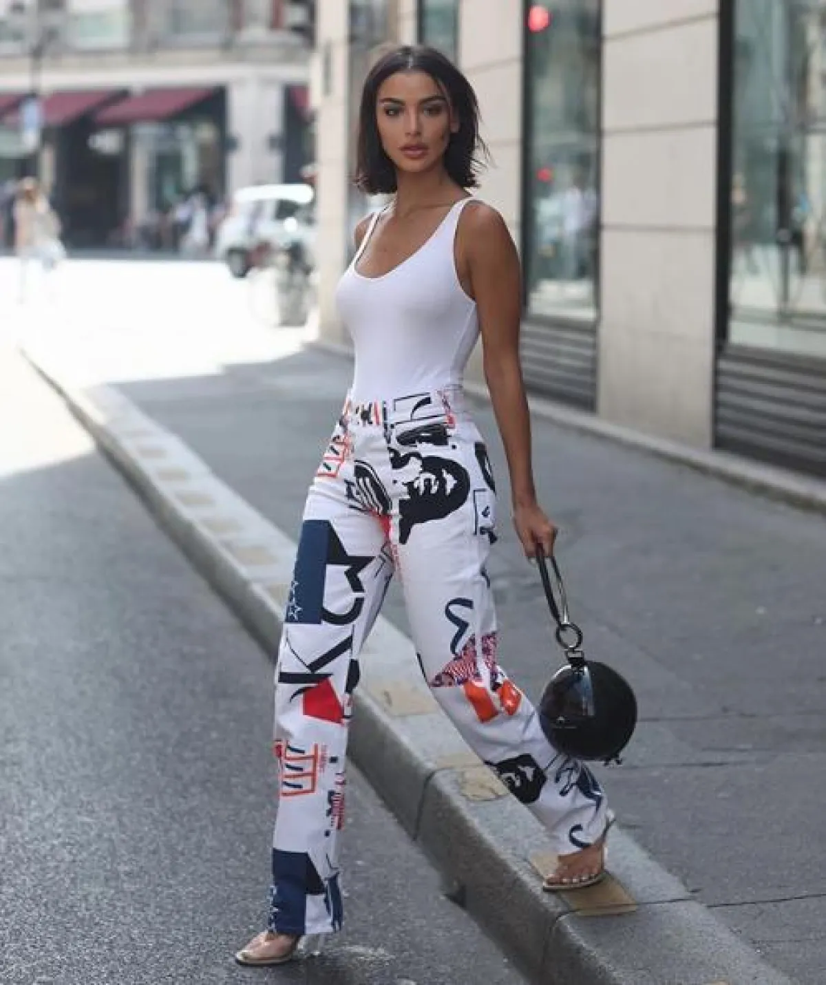 الفاشينيستا رانيا فواز اعتمدت الأسلوب الشبابي العصري خلال أسبوع الموضة في باريس للهوت كوتور، مثل هذا اللوك الذي اختارت فيه بنطلون جينز مُطبّعًا، بقصة أرجل واسعة، ونسقت معه توب باللون الأبيض، وصندلًا بكعب عالٍ من البلاستيك الشفاف، وشنطة يد مبتكرة على شكل كرة سوداء.