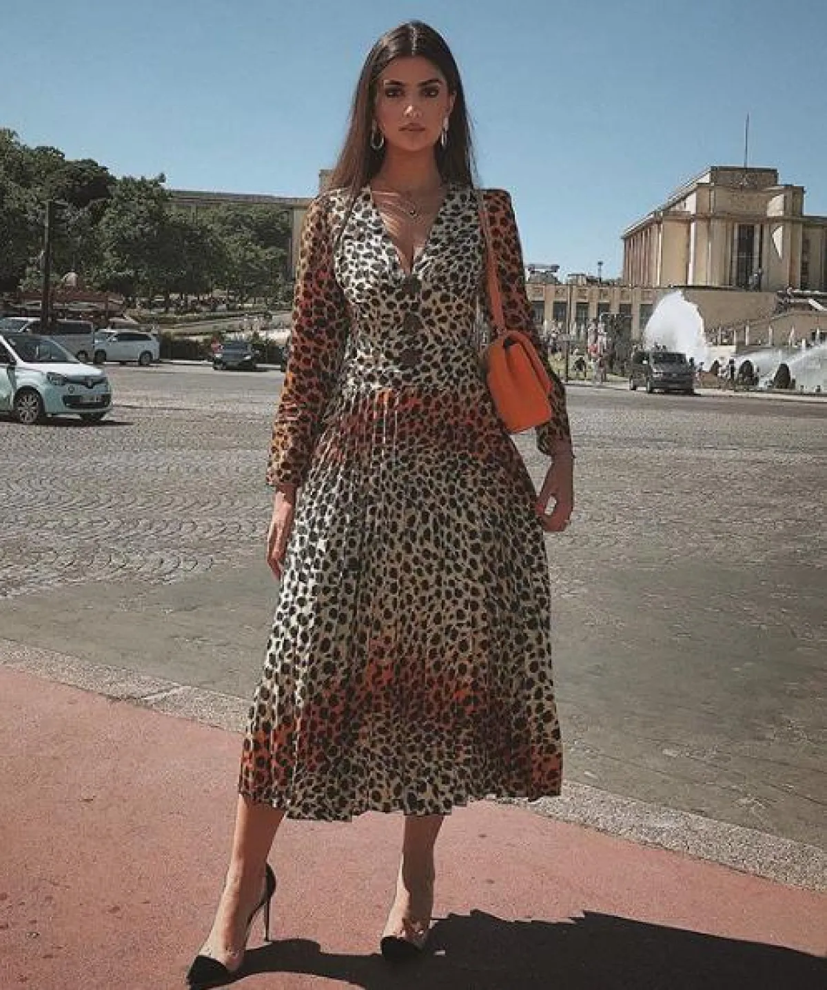 أما علا فرحات فقد اعتمدت بشكل عام الأسلوب الأنثوي الذي تخللته لمسات من العصرية، واختارت عددًا من التنسيقات المميزة، منها هذه الاطلالة التي نسقت فيها فستان بليسيه معرقًا بنقشة النمر، مع حذاء بكعب عالٍ باللون الأسود، وشنطة يد من “شانيل” Chanel باللون البرتقالي.