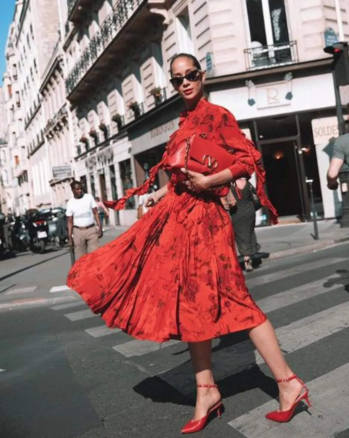 لانا الساحلي نسقت عددًا من الاطلالات المميزة خلال أسبوع الموضة، وقد لفتتنا هذه الاطلالة الكاملة باللون الأحمر، والتي اختارتها بكاملها من “فالنتينو” Valentino ونسقت فيها فستان ميدي معرقًا، مع شنطة يد كبيرة من الجلد، وحذاء أنيق بكعب متوسط.