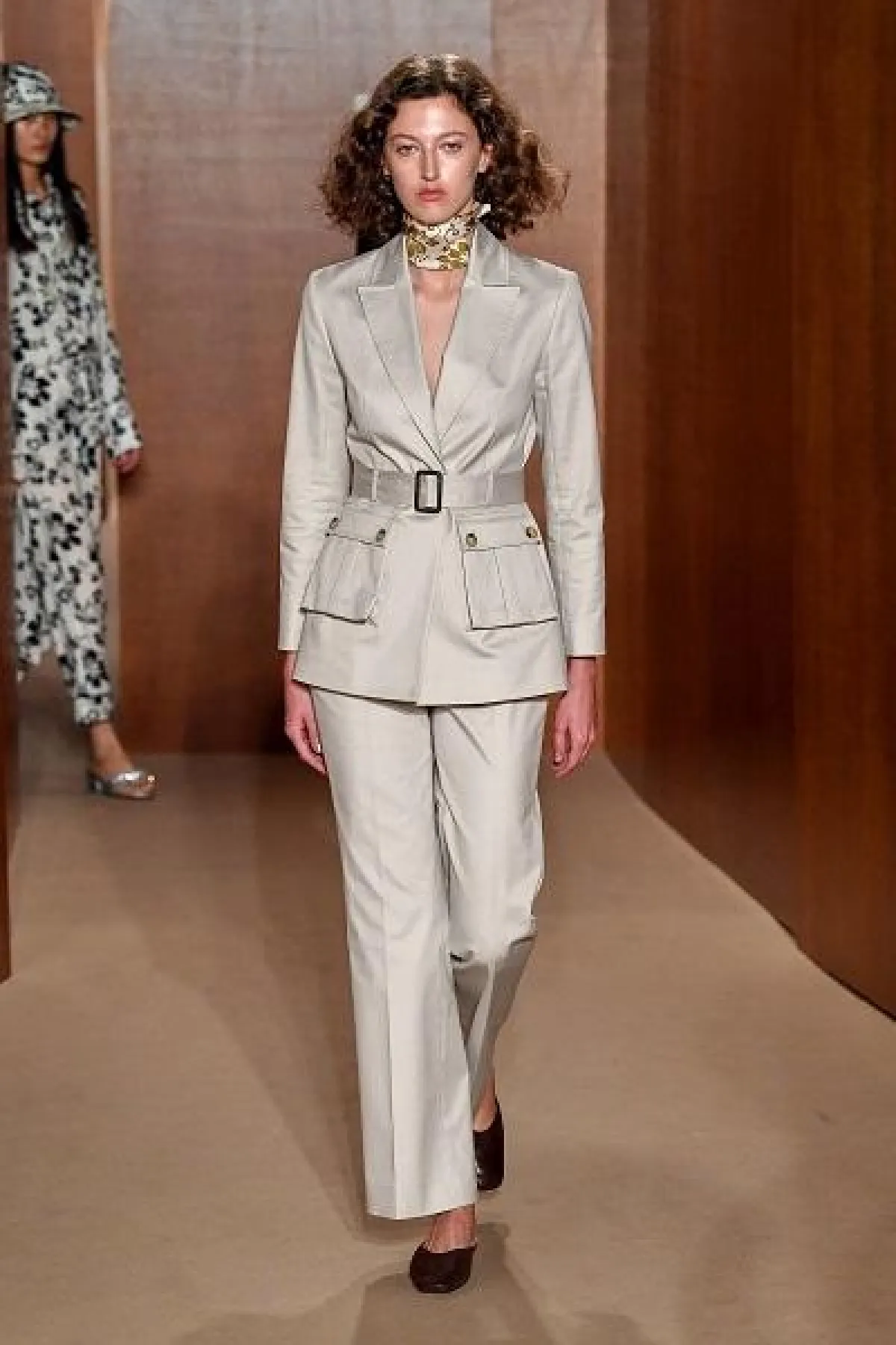 -ظهر حزام القماش العريض البيج ومكمّلاً للإطلالة بالطقم Suit على منصة أليكسا تشانغ Alexachung لصيف 2019 من خلال تحديده لخصر العارضة.