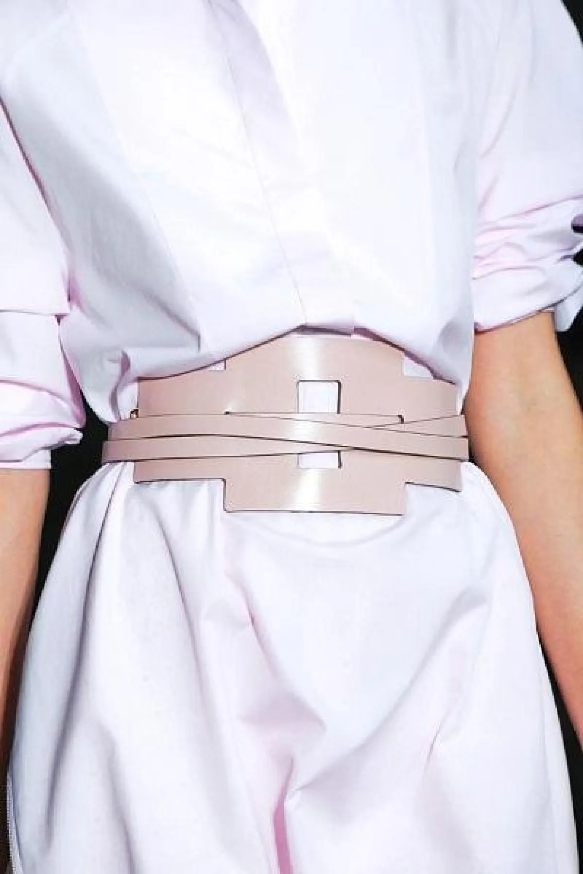 - وبرز الحزام العريض ضمن مجموعة ألتوزارا Altuzarra لموسم صيف 2019 باللون البيج من خلال تنسيقه مع إطلالة شبه رسمية لطقم مكوّن من جاكيت تنورة باللون الأسود، كاسراً من حدّته.