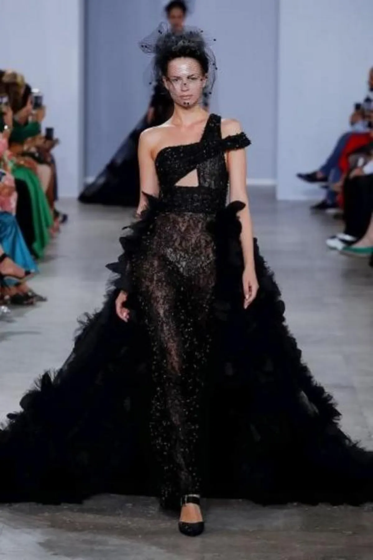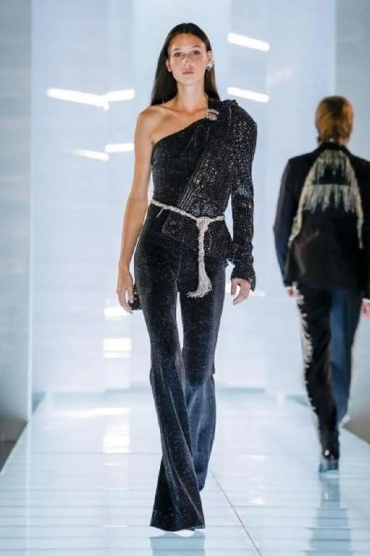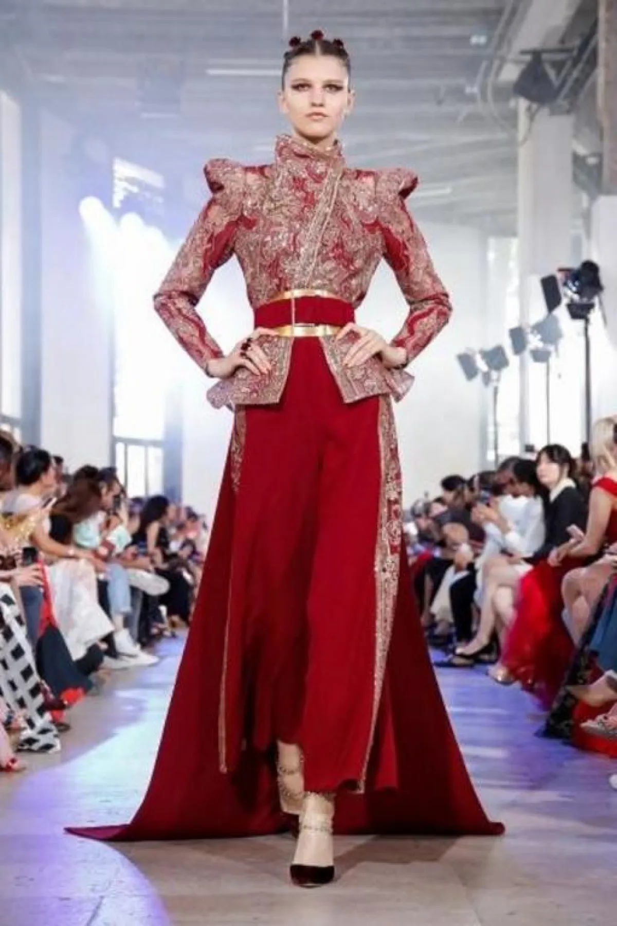 - تهادت عارضات المصمم اللبناني جورج شقرا Georges Chakra ببدلات شديدة الفخامة تميزت بالذيل الطويل المنبثق عن السترة، أعتمدي لتوحي بأن قامتك أطول مما هى عليه.