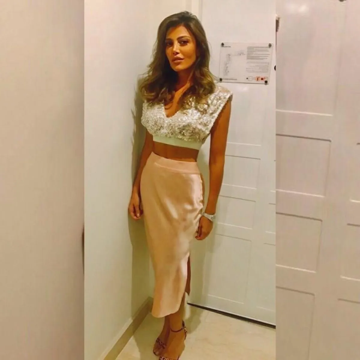 من أكثر الصيحات المولعة بها الفنانة ريهام حجاج هي موضة الكروب توب أي البلوز القصيرة، التي تمنح الجسم طولاً زائداً وتبعد الايحاءات بقصر القامة.