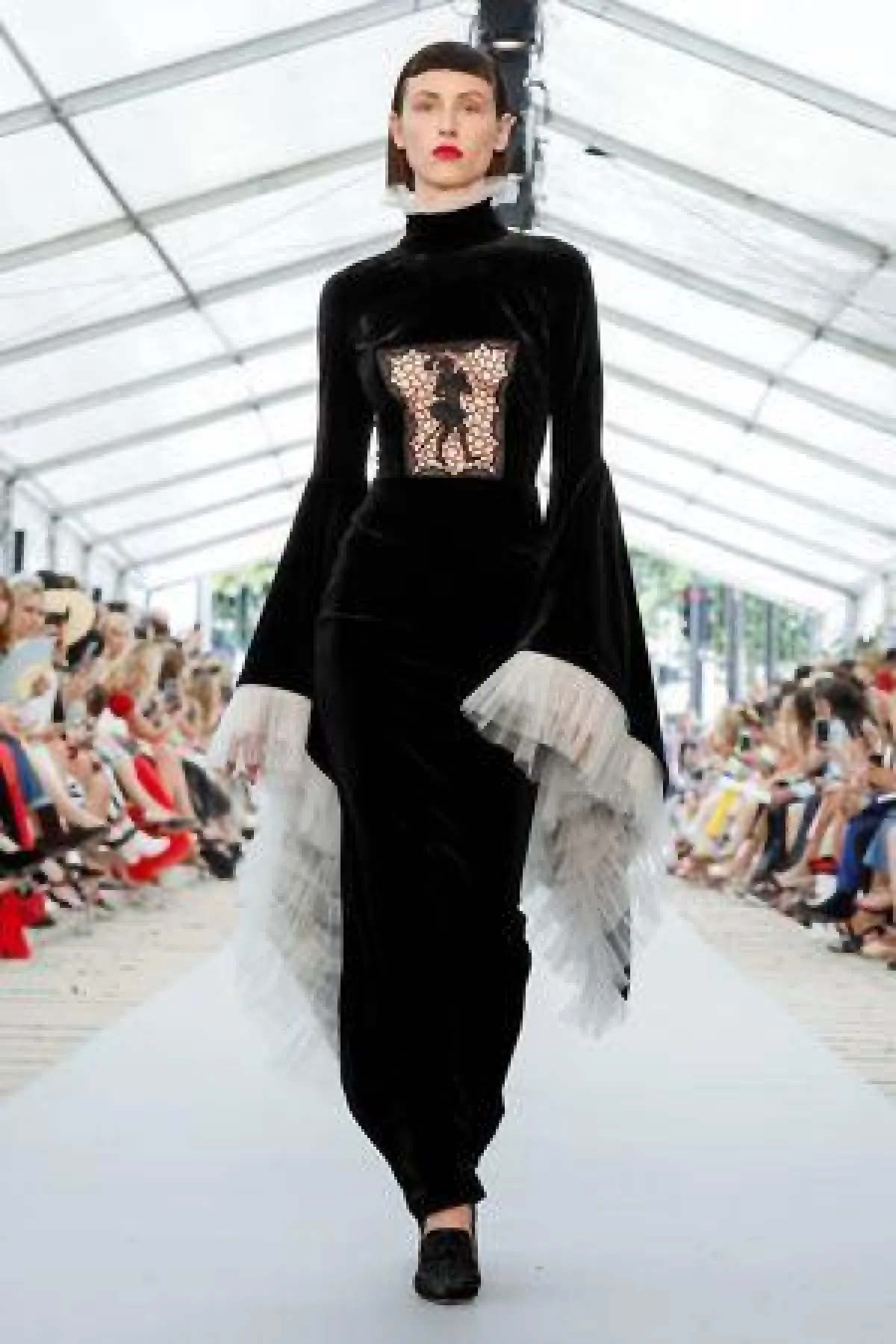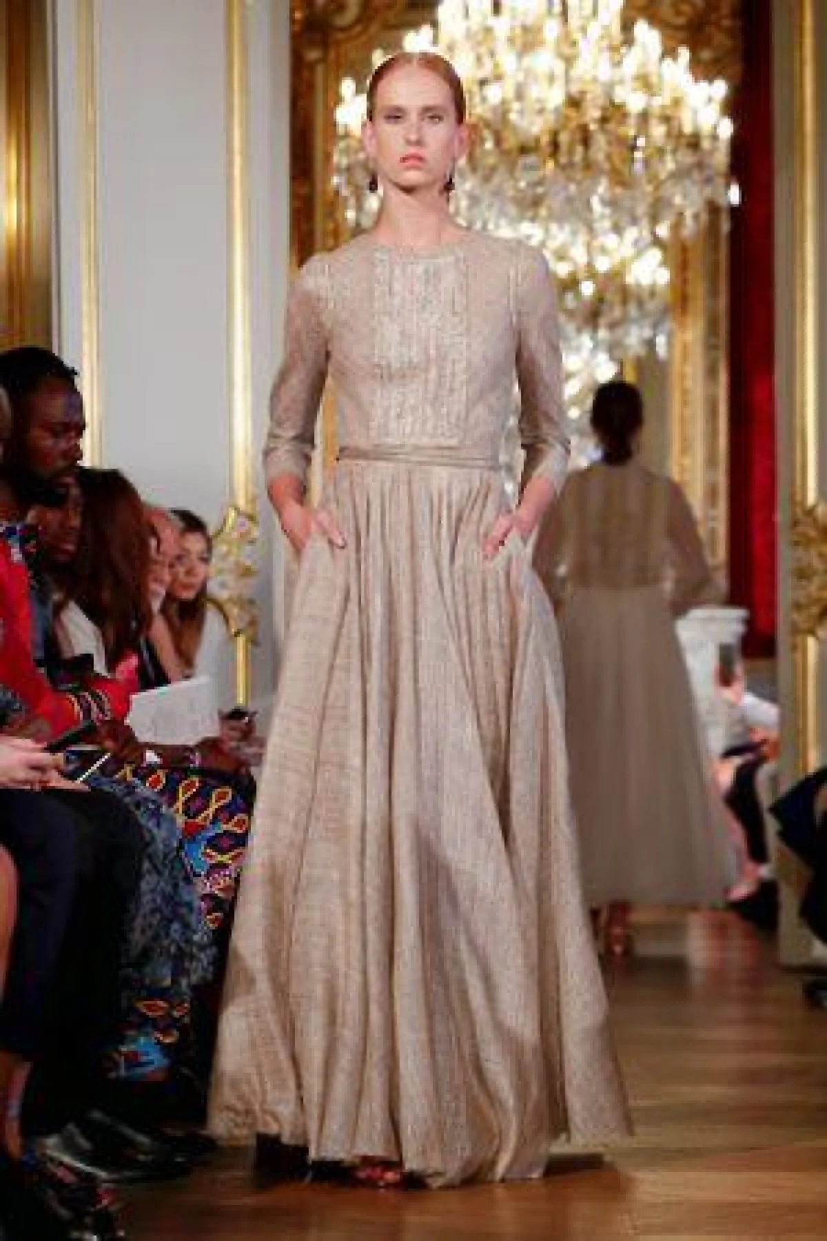 جاءت مجموعة Christophe Josse كريستوفر جوسي غايةً في النعومة والبساطة، لكنها لم تخلُ بالطبع من اللمسة المترفة، وبعض التصميمات جاءت بتصميم أقرب إلى القفاطين، مناسبة للصبايا الطويلات، كهذا الفستان النود مع حزام الخصر العريض، وبعض رسومات الدانتيل على الجزء الأمامي من الفستان، سيكون مميزًا لكِ إن كنتِ تبحثن عن لوك محتشم، وسهل التنسيق، مع حجاب نود أو وايت، وشوز بالألوان نفسها.