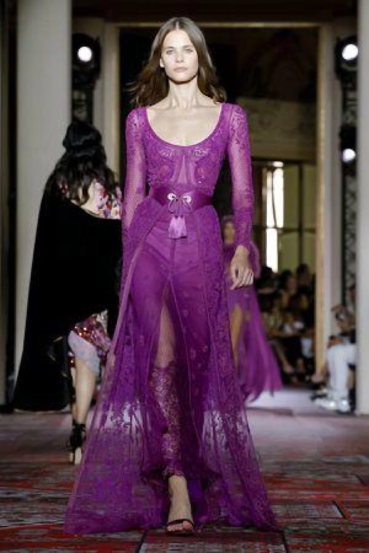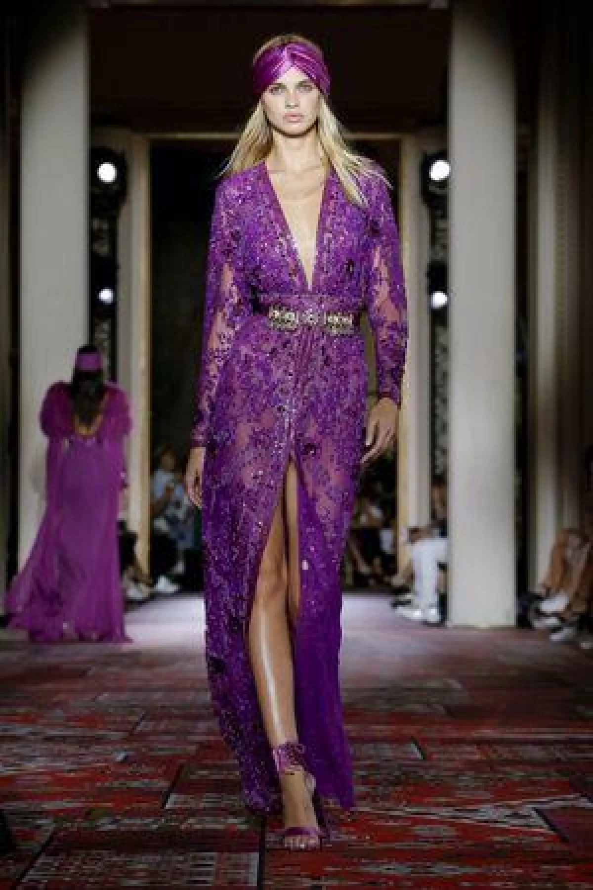 كالعادة نستطيع بكل بساطة أن نشاهد موديلات بعض الفساتين بقصة القفاطين من مجموعات زهير مراد للهوت كوتور، كهذا الفستان الأرجواني، بقصة تُبرز جمال الجسم، مع الفتحة الأمامية الجريئة، وحزام الخصر اللامع المعدني، والأكمام الطويلة، ونتوقع أن ترتدي كثير من النجمات هذا التصميم لاطلالة مترفة وفخمة، مع اللمسة العربية لموديلات القفاطين.