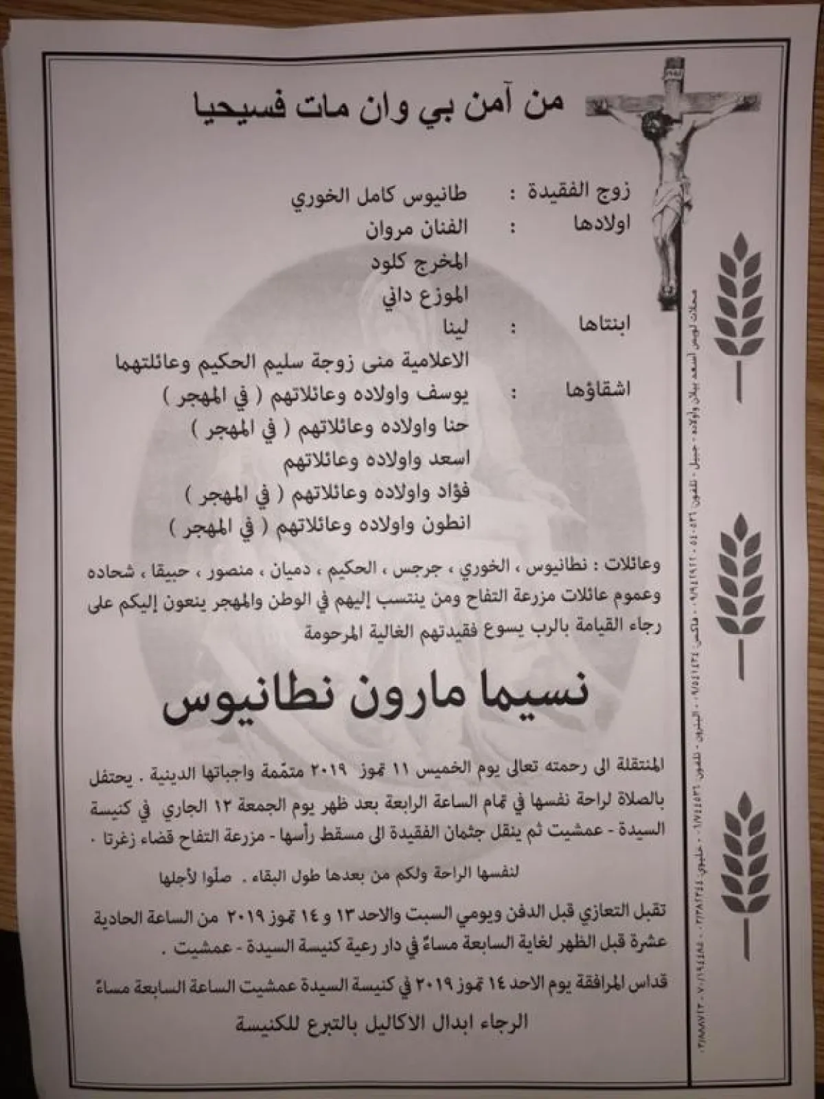مراسم الدفن ستقام يوم غدٍ الجمعة في مسقط رأس الفقيدة في مزرعة التفاح قضاء زغرتا شمال لبنان، على أن تقبل التعازي يومي السبت والأحد في دار رعية كنيسة السيدة في عمشيت.