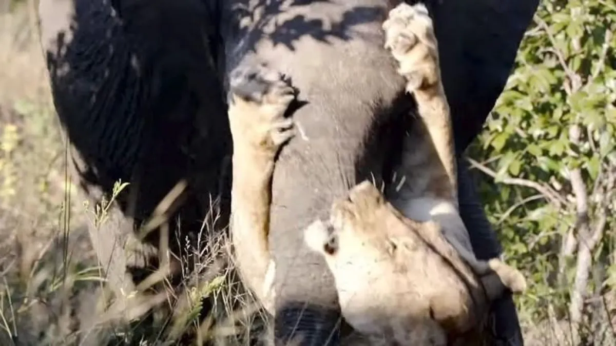 ويظهر الفيديو، الذي صوره أحد السياح أثناء جولة رحلة سفاري في محمية الحيوان الطبيعية بزيمبابوي، هجوم لبوة على فيل ضخم واعتلائها رأسه، وجرحه عدة مرات بمخالبها الحادة.