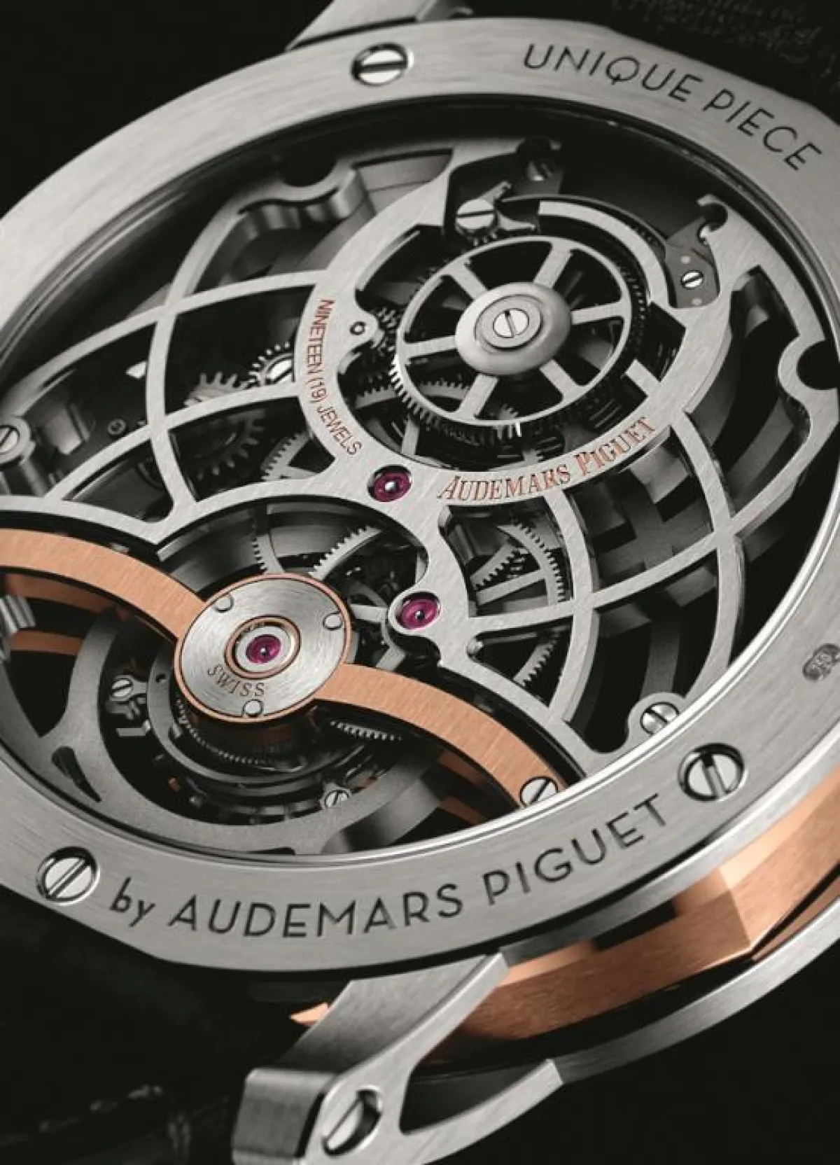 يُسلط هيكل هذه الساعة الفريدة، ذو اللونين، الضوء على التعقيد في التصميم الهندسي لساعة Code 11.59 by Audemars Piguet، حيث يضفي القسم الأوسط ثماني الشكل من الهيكل، والمصنوع من الذهب الوردي عيار 18 قيراط، تبايناً رائعاً ورصيناً مع الطوق النحيل جداً، والعروات والخلفية المصنوعة جميعها من الذهب الأبيض عيار 18 قيراط. كل ذلك فضلاً عن التشطيبات النهائية مثل تقنيات شطف الحواف، والصقل الخطي الناعم، والصقل اللامع التي تُجرى عادة على حركات الساعات، ولكنها هنا تبدو واضحة بجماليةٍ إضافية على الطوق والعروات والهيكل. ويكتمل التفرُّد من خلال النقش الذي يظهر على خلفية هيكل الساعة باللغة الإنجليزية: "قطعة فريدة".