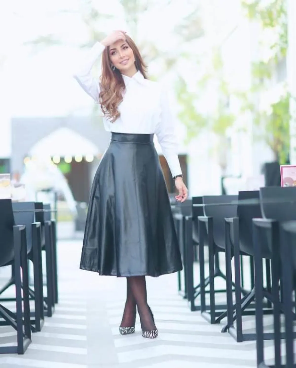 نسقت نور الغندور القميص الأبيض مع تنورة من الجلد باللون الأسود، حيث إنّ دمج اللونين مع بعضهما، يعطي الكثير من الأناقة.