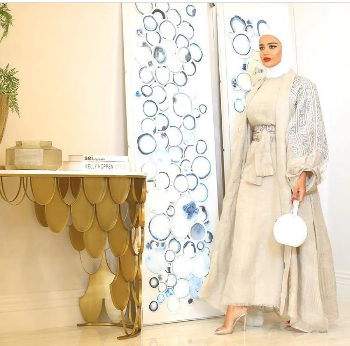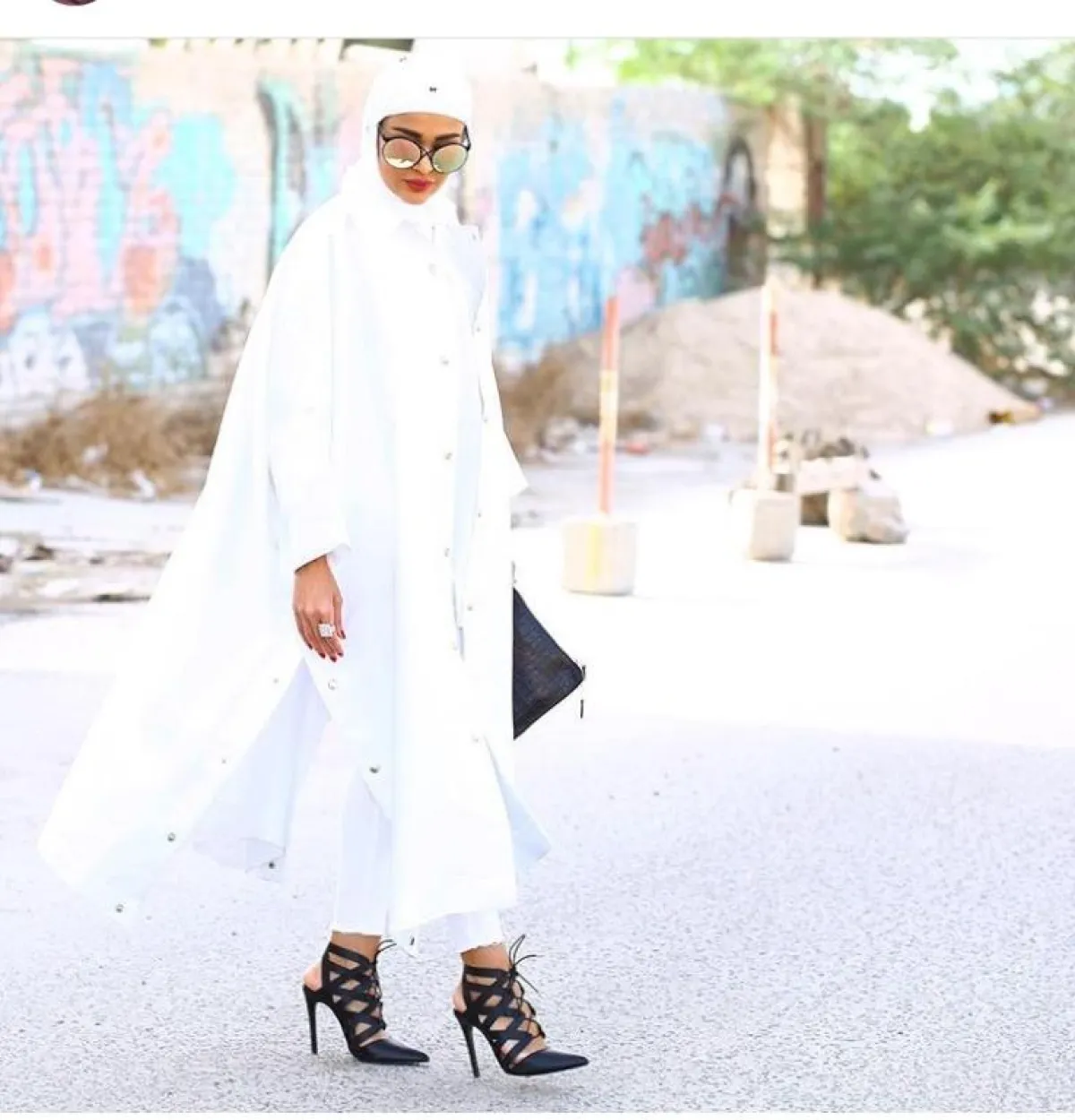 هذا اللوك سوف تقعين بغرامه بالتأكيد، فمع العباية البيضاء العصرية المحايدة مع لفة الحجاب من نفس اللون، استطاعت مرمر أن تلعب باللوك لتنتعل حذاء شبكيا لافتا للنظر بكعب عالٍ، ونظارة مدورة كبيرة الحجم عاكسة، مع كلتش عريض من الجلد، لإطلالة تناسب ذوقك المترف طوال اليوم، اعتمديها إن كنت تريدين لفت الانظار والظهور بأجمل شكل بأحد أيامك المهمة.