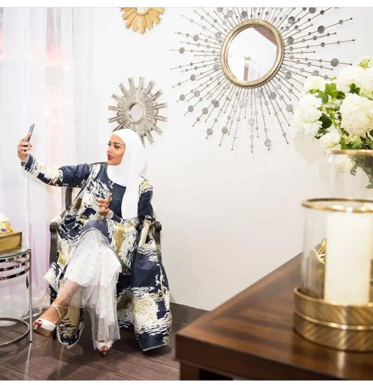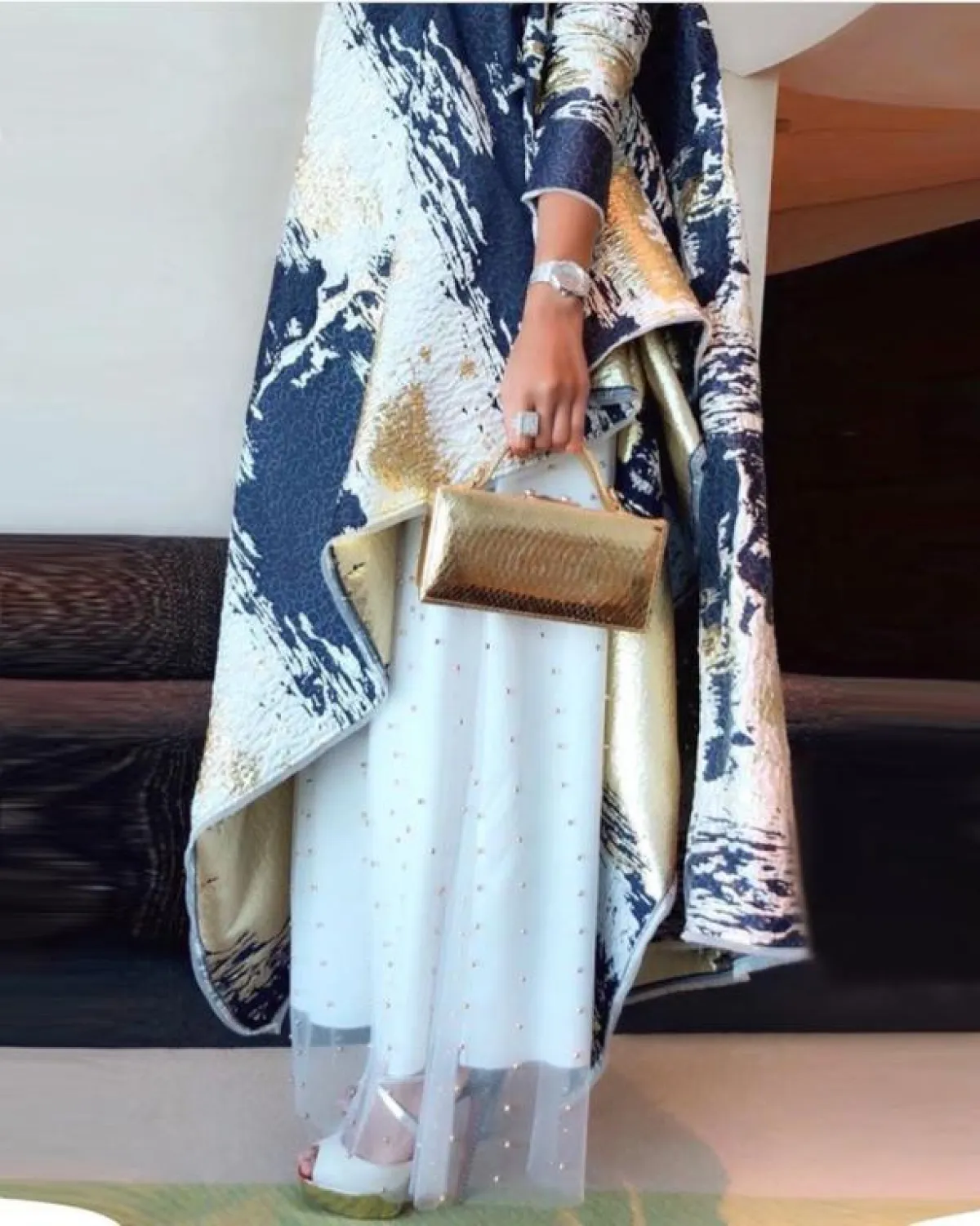 اعتمدت مدونة الموضة مرمر محمد على العباية الجاكار الملونة بلمسات ذهبية وزرقاء اللون، مع التول المنسدل المنقط، نسقت معه صندلا مفتوحا من الأمام باللون الأبيض بكعب عال جدا، وكلتش ذهبيا لامعا مستطيلا، وأكملت اللوك بالمجوهرات المترفة الماسية، لتناسب اللوك الكلاسيكي، ولم تتقيد بوضع مجوهرات ذهبية.
