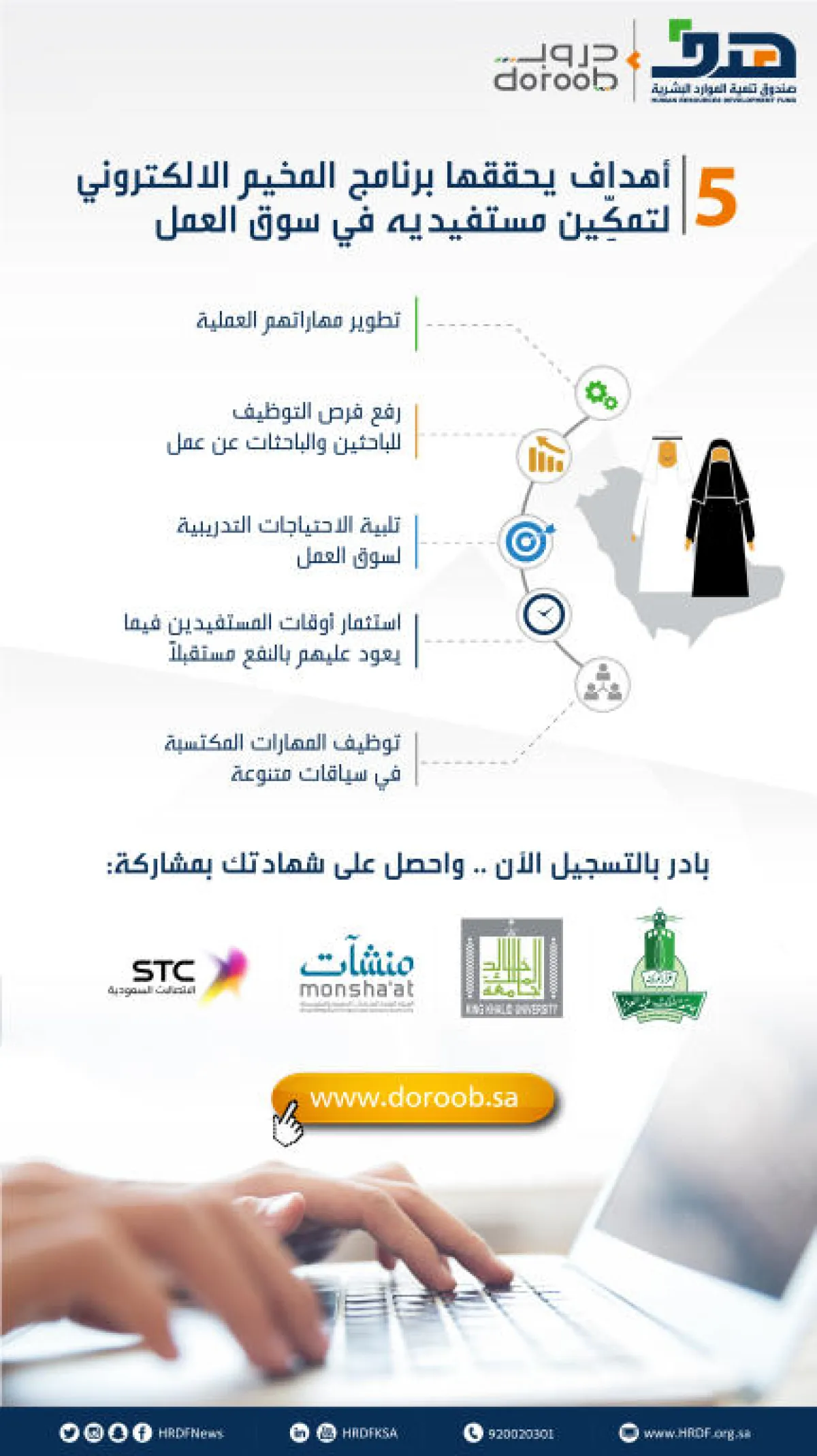 يُحقِق برنامج المخيم الإلكتروني، الذي أطلقه صندوق تنمية الموارد البشرية (هدف) الأحد الماضي، خمسة أهداف تساعد على تمكين مستفيديه في سوق العمل، وتتمثل في تطوير مهاراتهم العملية، ورفع فرص التوظيف للباحثين عن عمل، وتلبية الاحتياجات التدريبية لسوق العمل، بالإضافة إلى استثمار أوقات المستفيدين فيما يعود عليهم بالنفع مستقبلاً، وتوظيف المعارف والمهارات المكتسبة من البرنامج في سياقات متنوعة.