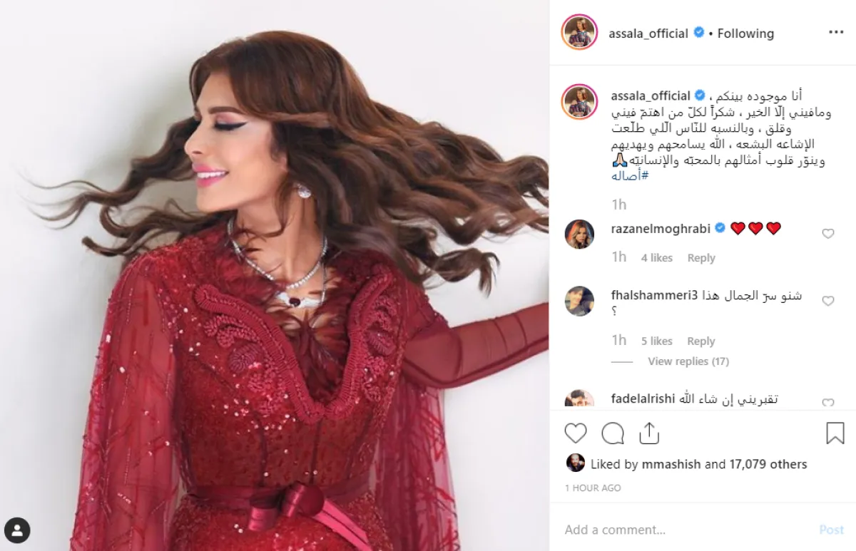 أصالة نشرت صورة لها من إطلالتها الأخيرة في الباحة حيث قدمت مؤخرا حفلا غنائيا ضمن موسم صيف جدة، وعلقت عبر حسابها بموقع إنستقرام قائلة: أنا موجوده بينكم، ومافيني إلّا الخير، شكرًا لكلّ من اهتمّ بي وقلق، وبالنسبه للنّاس الّلي طلّعت الإشاعة البشعة، الله يسامحهم ويهديهم وينوّر قلوب أمثالهم بالمحبّة والإنسانيّة.