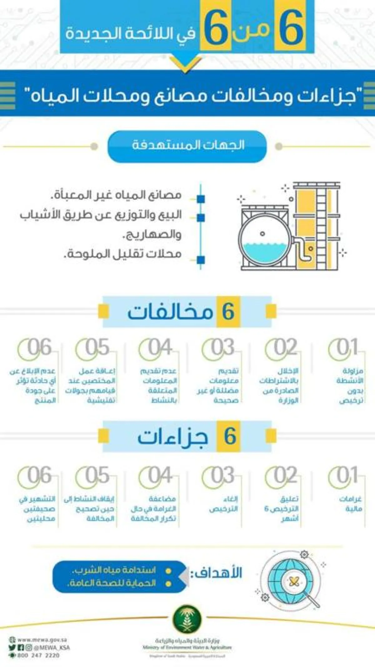 وقالت وزارة البيئة والمياه والزراعة، إنّ اللائحة الجديدة تستهدف مصانع المياه غير المعبأة، وبيع وتوزيع المياه عن طريق الأشياب والصهاريج، ومحلات تقليل الملوحة، مبينةً، أن الجزاءات تتضمّن غرامات مالية عالية وإلغاء الترخيص أو تعليقه لمدة لا تزيد على 6 أشهر.