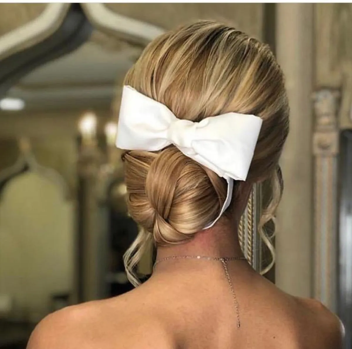 من اللمسات العتيقة التي تعتمدها الصبايا، هو اكسسوارت الفيونكة من خامة الساتان الناعمة، لاطلالة مخملية وناعمة، اعتمديها مع تسريحة الكعكة لتُبرزي جمال تسريحتِك، ومن الممكن أن تنسدل منها طرحتكِ التول أو الدانتيل.