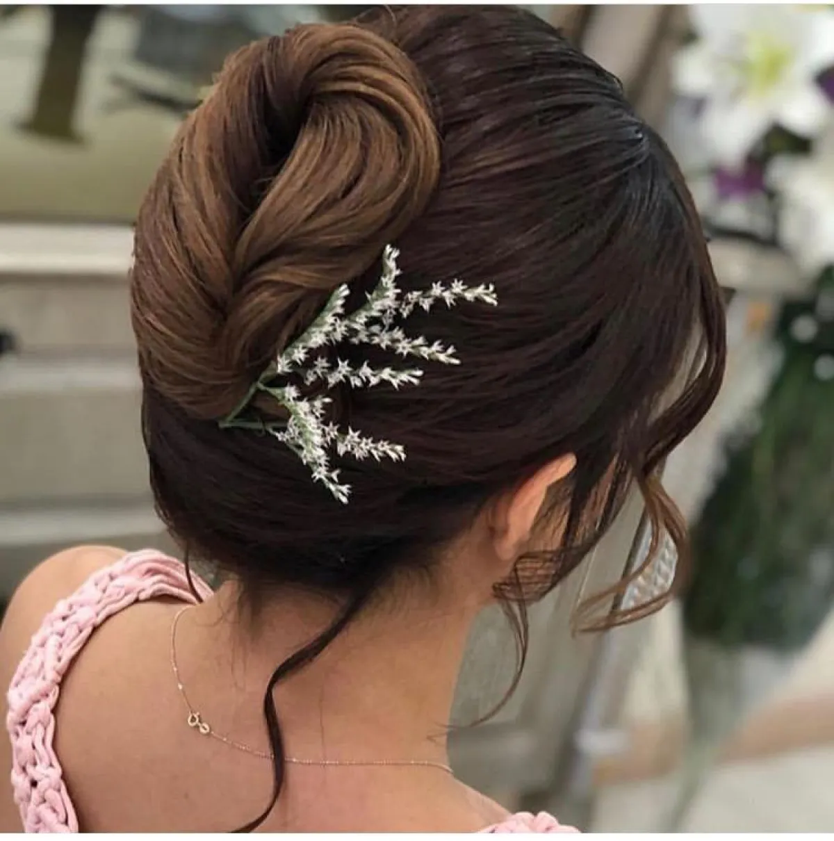 اكسسوارات الشعر المصنوعة من الورود تناسب كل التسريحات، يمكنكِ اختيار فرع صغير باللون الأخضر على أحد جانبي الكعكة، أو اختاري طوق الورود على الرأس، أو اعتمدي على اكسسوارات الشعر الموزعة بطريقة ناعمة على الشعر المفرود بالكامل.