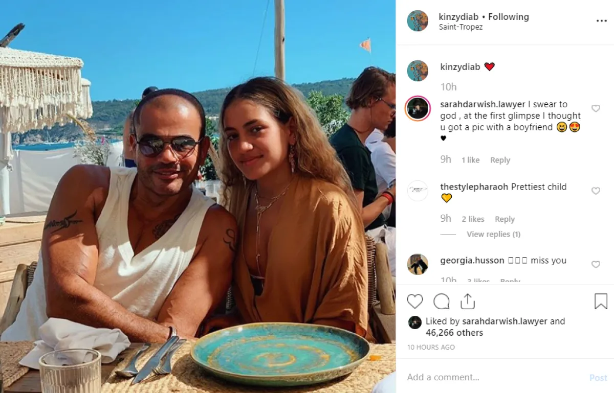 كنزي لم تضع تعليقا على صورتها مع والدها إلا "قلب أحمر" تعبيرا عن الحب، وحرصت على الإشارة لمكان تواجدهما بخليج سان تروبيه، وبعدها بدقائق قام شقيقها عبد الله بنشر صورة له برفقة والده المنشغل بحديث مع شخص آخر لم يظهر في الصورة، ولكن بدا واضحا الوشم الذي يحمل اسم عبدالله على كتف عمرو دياب.