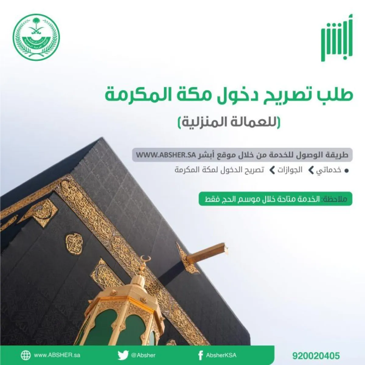 أوضحت منصة الخدمات الإلكترونية لوزارة الداخلية "أبشر"، طريقة طلب تصريح دخول مكة المكرمة خلال موسم الحج للعمالة المنزلية إلكترونياً، عبر حساب المستفيد في المنصة.