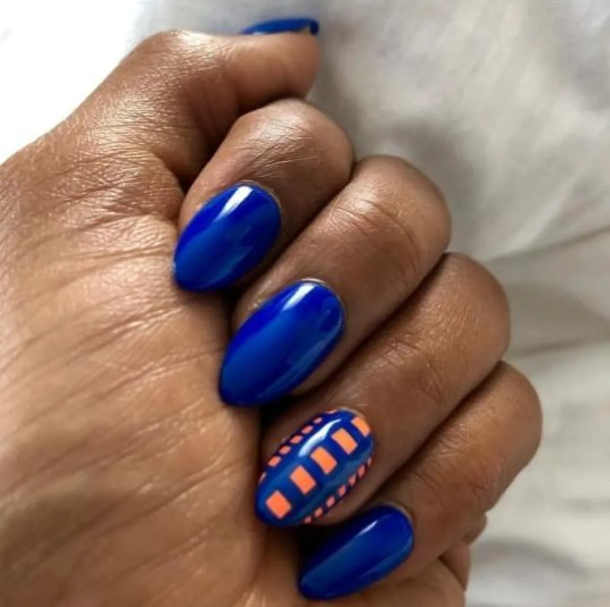 إذا كنت لست جاهزة لصيحات المناكير الجريئة، وتحديداً المناكير البرتقالي، بإمكانك استخدام هذا اللون بطريقة ناعمة ومميزة في الوقت نفسه، وذلك على طريقة النجمة كيري واشنطن، بحيث تستخدمين المناكير باللون الأزرق الداكن، أو اليوسفي، ومن ثم ترسمين بواسطة المناكير البرتقالي شكلاً هندسياً مميزاً.