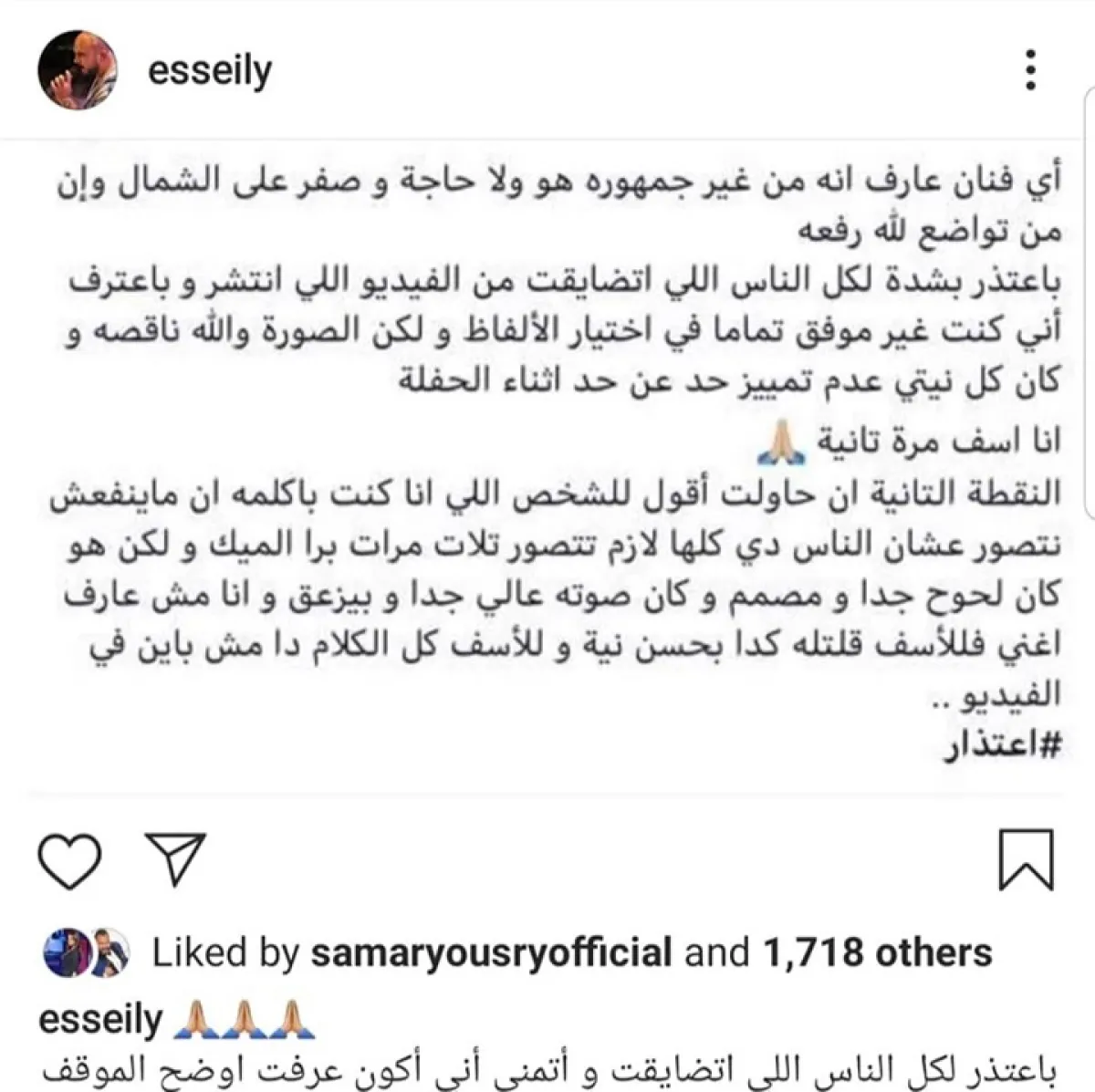 وكتب العسيلي في اعتذار رسمي من كل جمهوره: أي فنان عارف أنه من غير جمهوره هو ولا حاجة وصفر على الشمال، وإن من تواضع لله رفعه، باعتذر بشدة لكل الناس اللي اتضايقت من الفيديو اللي انتشر، وباعترف أني كنت غير موفق تماما في اختيار الألفاظ لكن الصورة والله ناقصة وكان كل نيتي عدم تمييز حد عن حد أثناء الحفلة انا اسف مرة تانية.