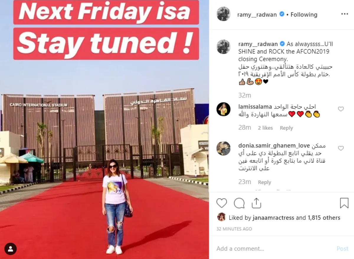 الإعلامي رامي رضوان نشر أول صورة لزوجته الفنانة دنيا سمير غانم، من كواليس استعدادها لحفل ختام بطولة كأس الأمم الأفريقية مصر 2019، ترتدى فيها تي شيرت ابيض وبنطلون جينز مقطعا وعلق على الصورة عبر حسابه على موقع إنستقرام قائلا: حبيبتي كالعادة هتتألقي.. وهتنوري حفل ختام بطولة كأس الأمم الأفريقية 2019.