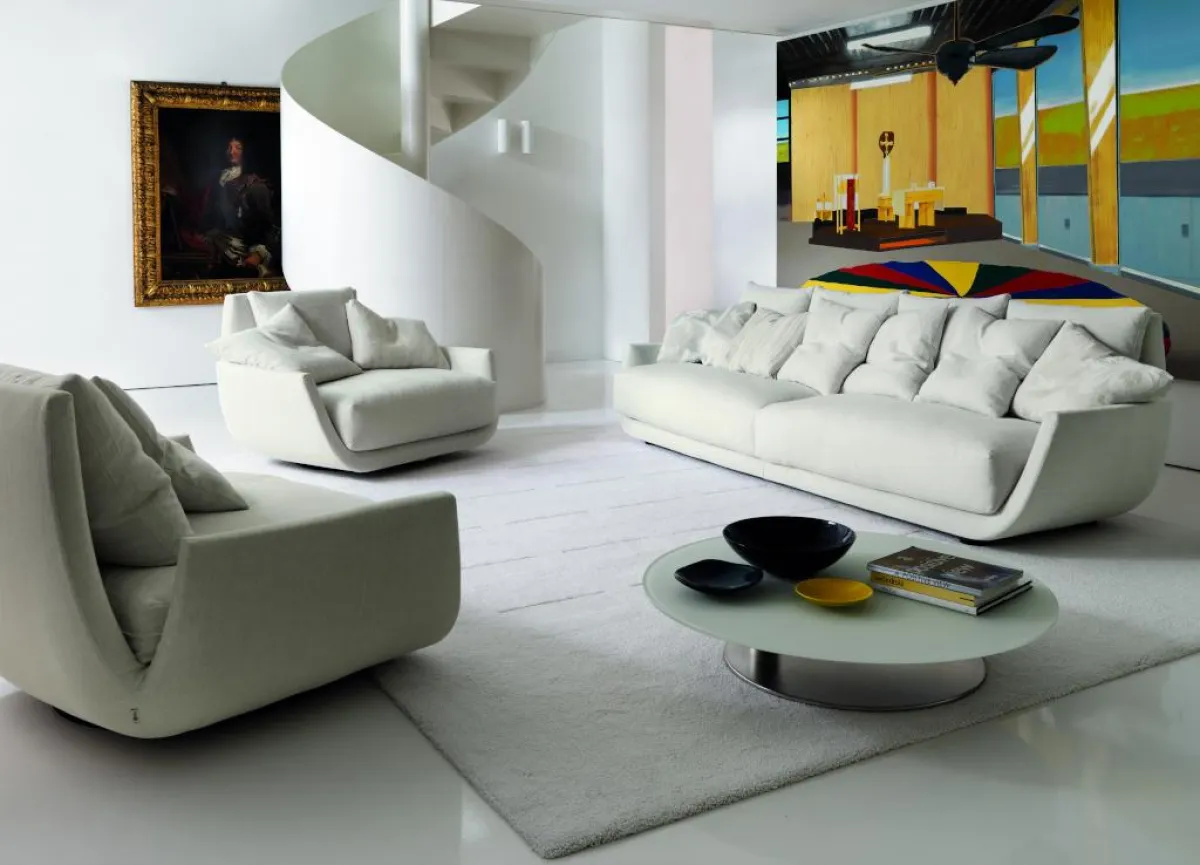 من المُلاحظ في تصميمات أثاث غرف المعيشة، الاستغناء جزئيًّا عن أطقم الكنب الكاملة، خصوصًا في المساحات المحدودة