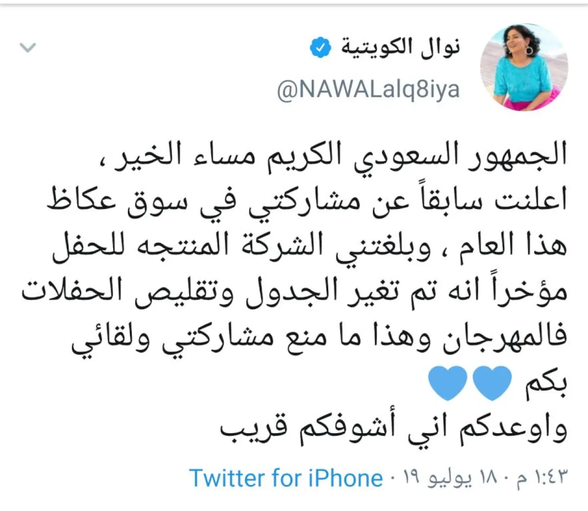 وقالت: "الجمهور السعودي الكريم مساء الخير، أعلنتُ سابقًا عن مشاركتي في سوق عكاظ هذا العام، وبلَّغتني الشركة المنتجة للحفل مؤخرًا أنه تمَّ تغيير الجدول وتقليص الحفلات في المهرجان، وهذا ما منع مشاركتي ولقائي بكم، وأوعدكم إني أشوفكم قريب".