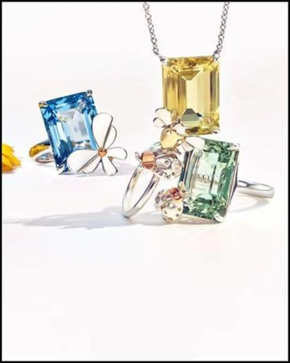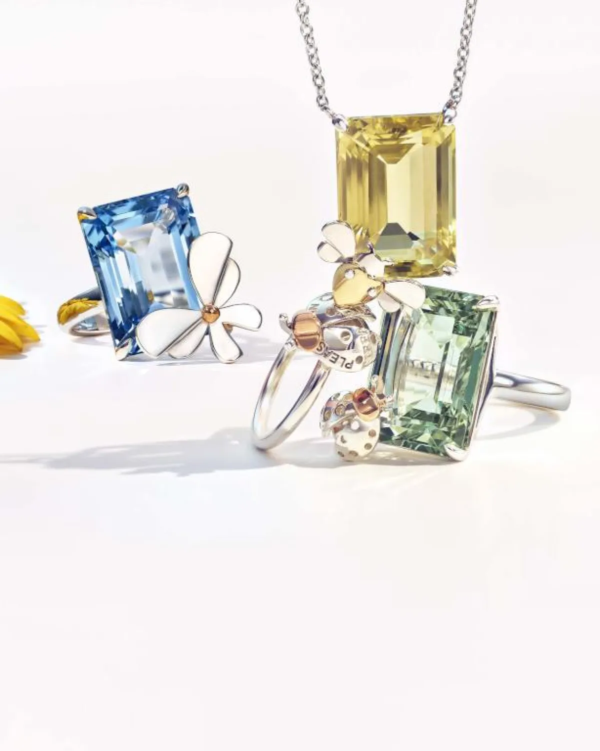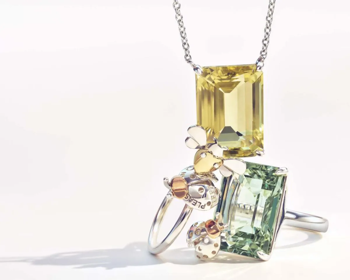 وتأتي المجوهرات في التشكيلة مرصّعة بالألماس، إضافة إلى أحجار ملونة تشمل الأماثيست، والتوباز الأزرق، والكوارتز الأصفر والأخضر. ويتراوح مزيج المعادن من الذهب (الأصفر والوردي والأبيض) إلى الفضة الخالصة بصور ظلية مختلفة مثل دبابيس الزينة والبروش والقلادات والخواتم، لإظهار الحس المرهف للمجوهرات الراقية.