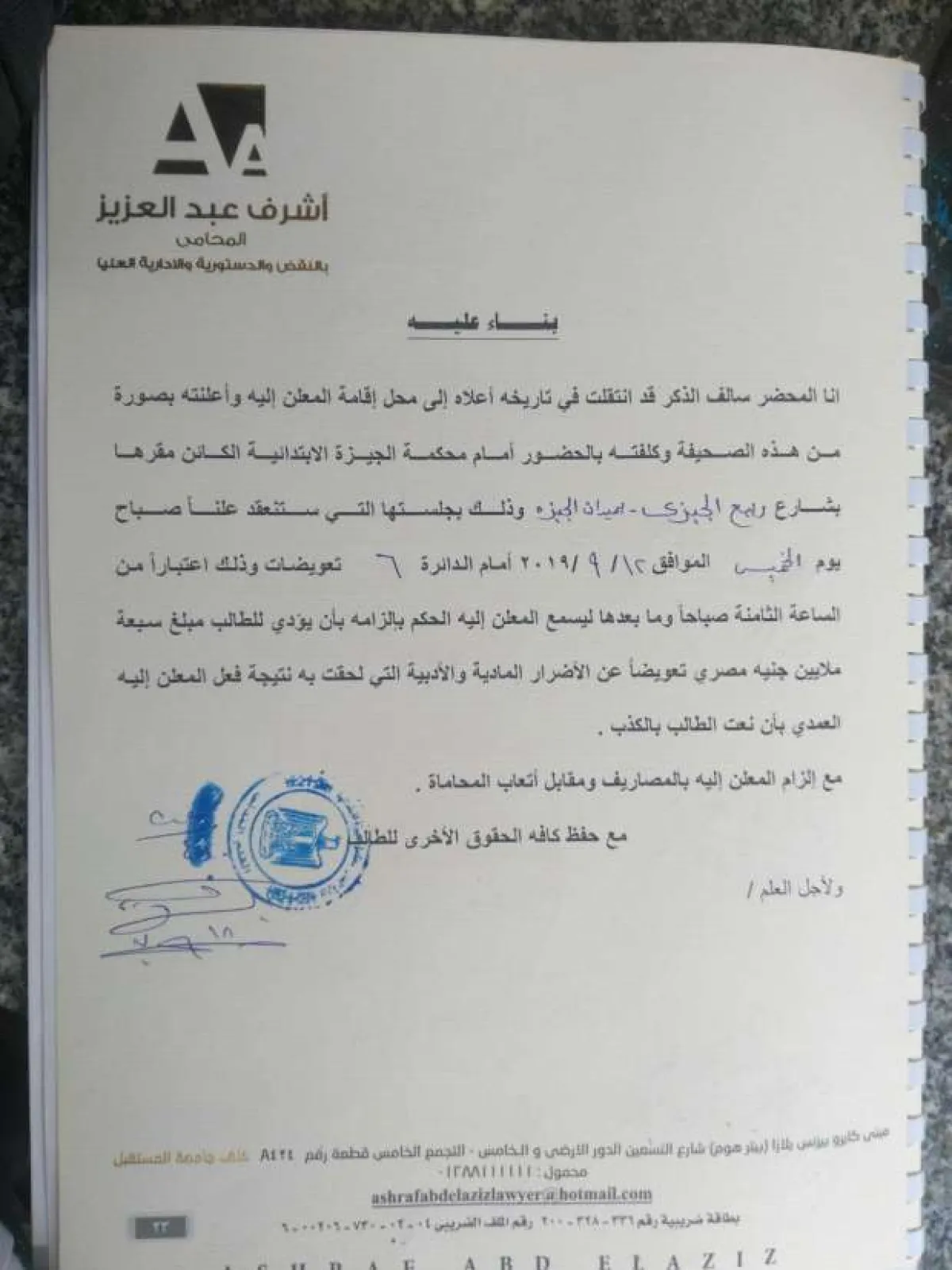 الدعوى تم تقديمها إلى محكمة الجيزة الابتدائية وستبدا الجلسة الأولى يوم الخميس 12 سبتمبر المقبل أمام دائرة التعويضات، واستند فيها عبد المتعال إلى صدور حكم نهائي ضد محمد رمضان من محكمة جنح مستأنف الدقي في 26 يونيو الماضي، بتغريم الفنان 10 آلاف جنيه وإلزامه بالتعويض المدني 10001 جنيه، في الجنحة رقم 10866 لسنة 2018 للسب والتشهير بـ محمد عبدالمتعال مدير عام قنوات "mbc مصر"، مع قبول الاستئناف المقدم من رمضان شكلًا على حكم حبسه ستة أشهر مع إيقاف التنفيذ لمدة ثلاث سنوات.