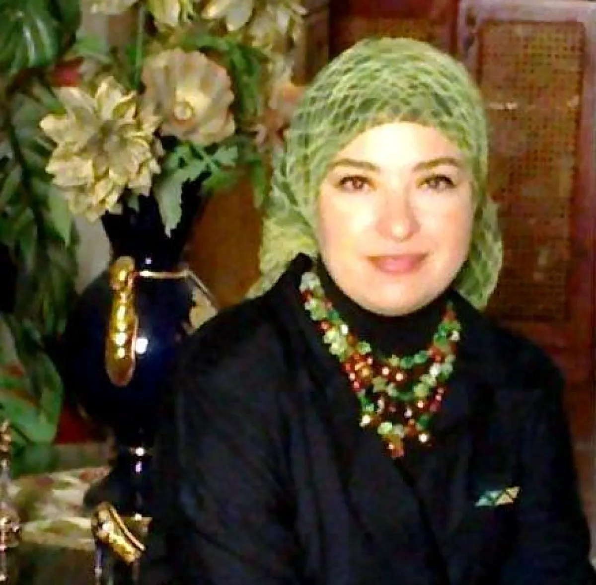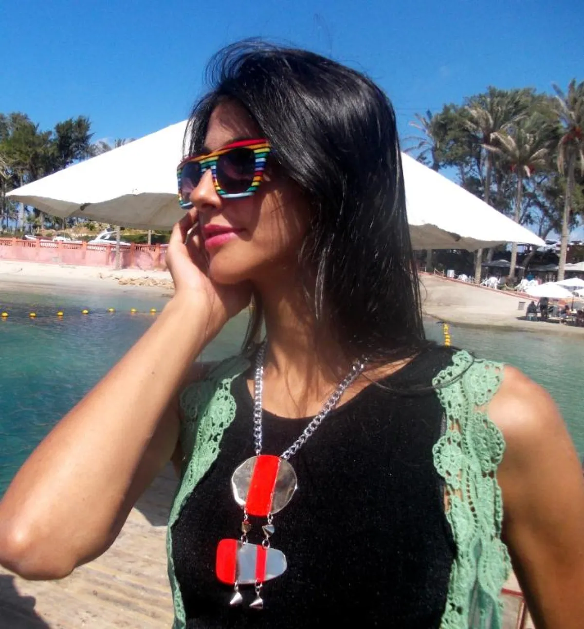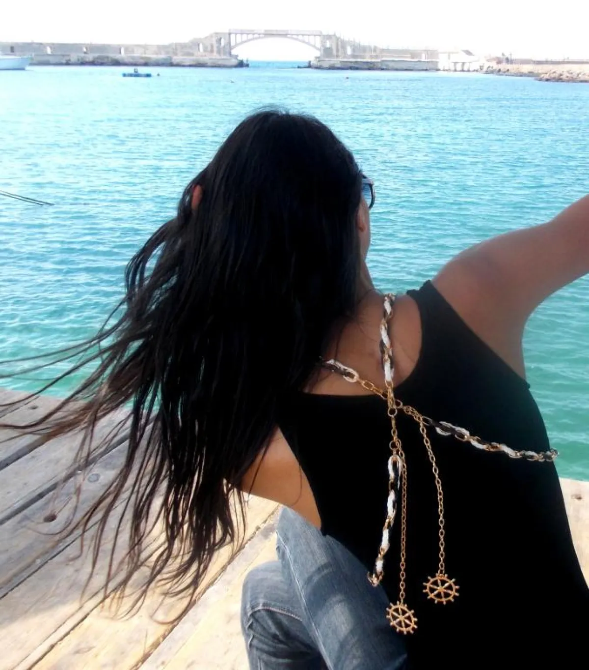 1 ـ  عقد للرقبة من الزجاج مستوحى من فن الزجاج المعشّق، مصنوع يديوياً بالكامل. هو عقد من الزجاج الأزرق وذو إطار ذهبيّ مشكّل يديوياً، مع حلق على شكل ورقة شجر من الزجاج. وإدخال فن الزجاج المعشق بالزجاج والمرايا، في الاكسسوارات، هو ابتكار انفردت به، واشتهرت بتفردّها  بتقديمه.